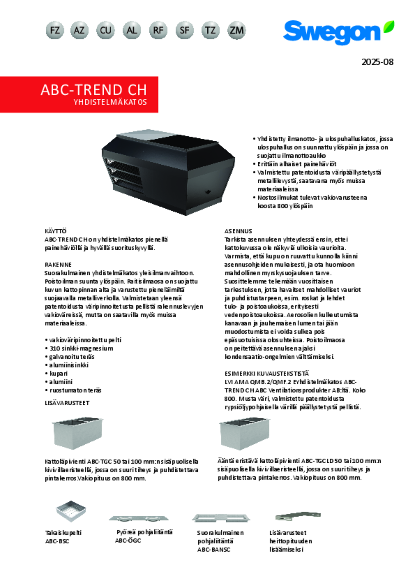 - Yhdistetty ilmanotto- ja ulospuhalluskatos, jossa ulospuhallus on suunnattu ylöspäin ja jossa on suojattu ilmanottoaukko