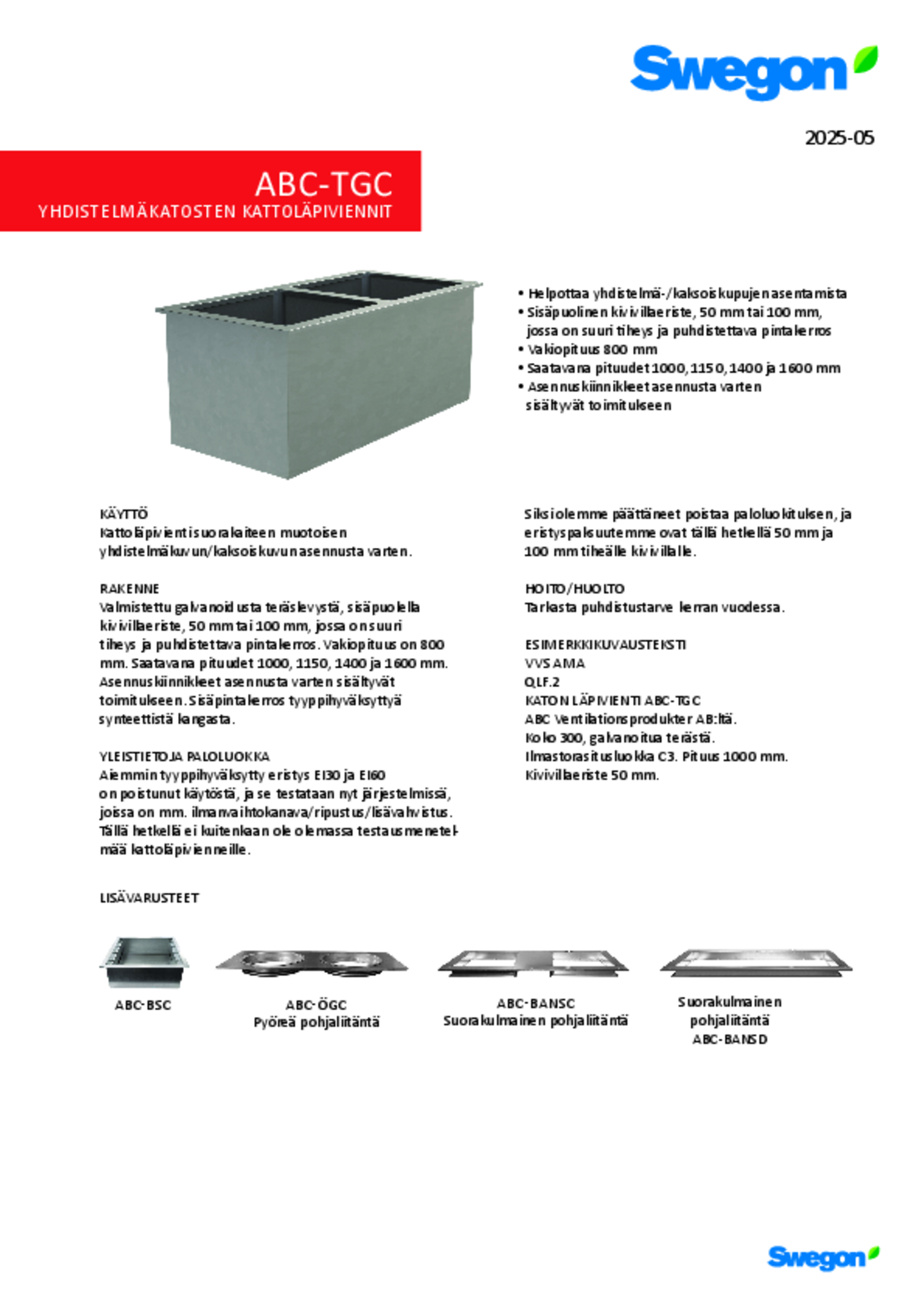 - Sisäpuolinen kivivillaeriste, 50 mm tai 100 mm, jossa on suuri tiheys ja puhdistettava pintakerros