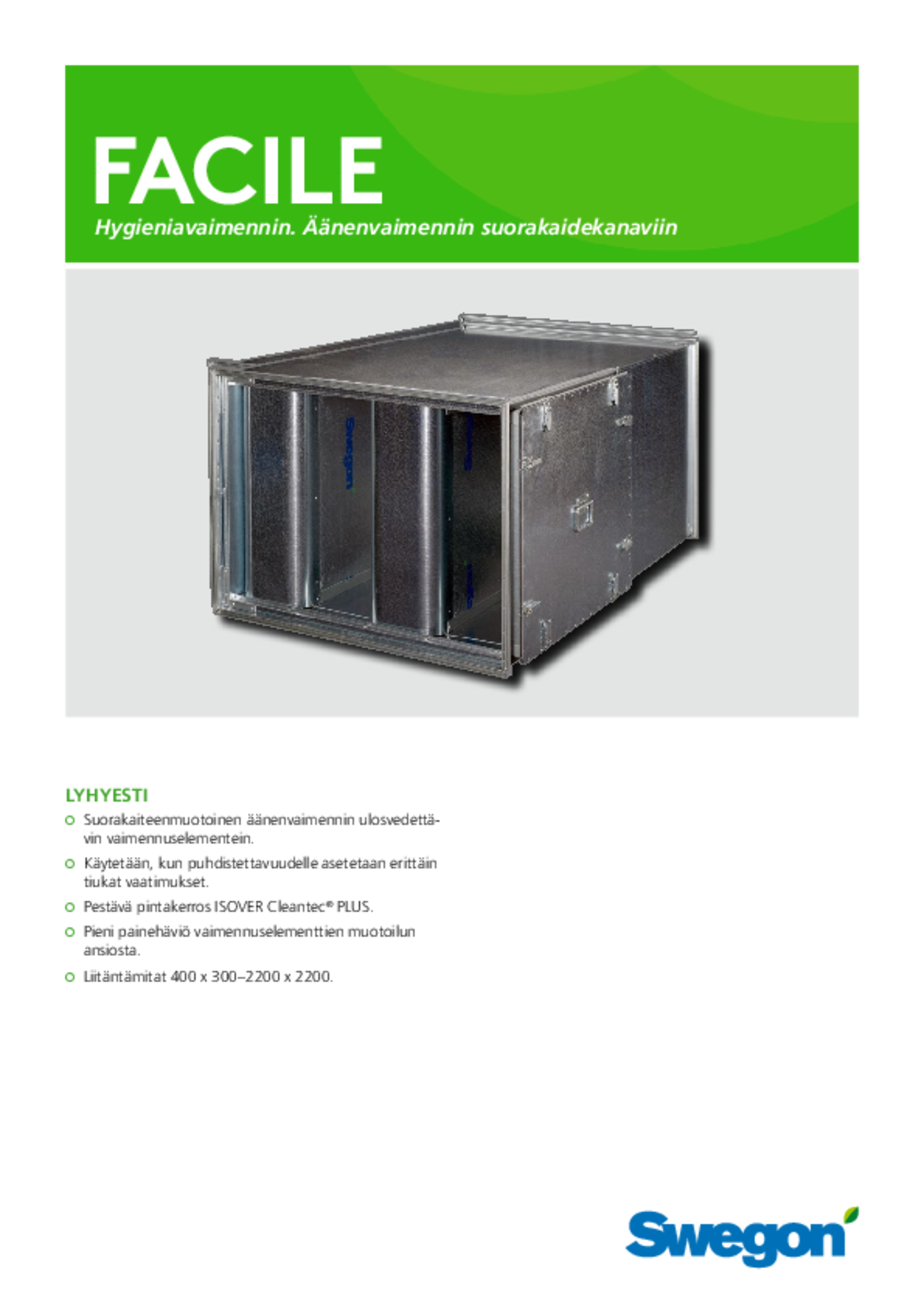 FACILE on hygieeninen äänenvaimennin silloin kun vaaditaan korkeita puhdistettavuusvaatimuksia ja ulosvedettäviä vaimennuskeskiöitä.