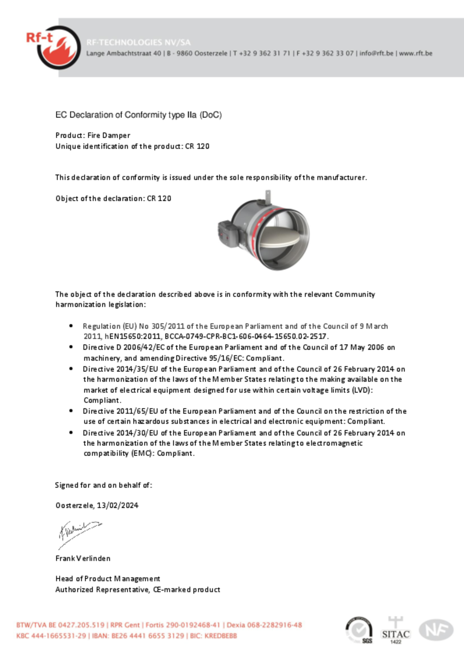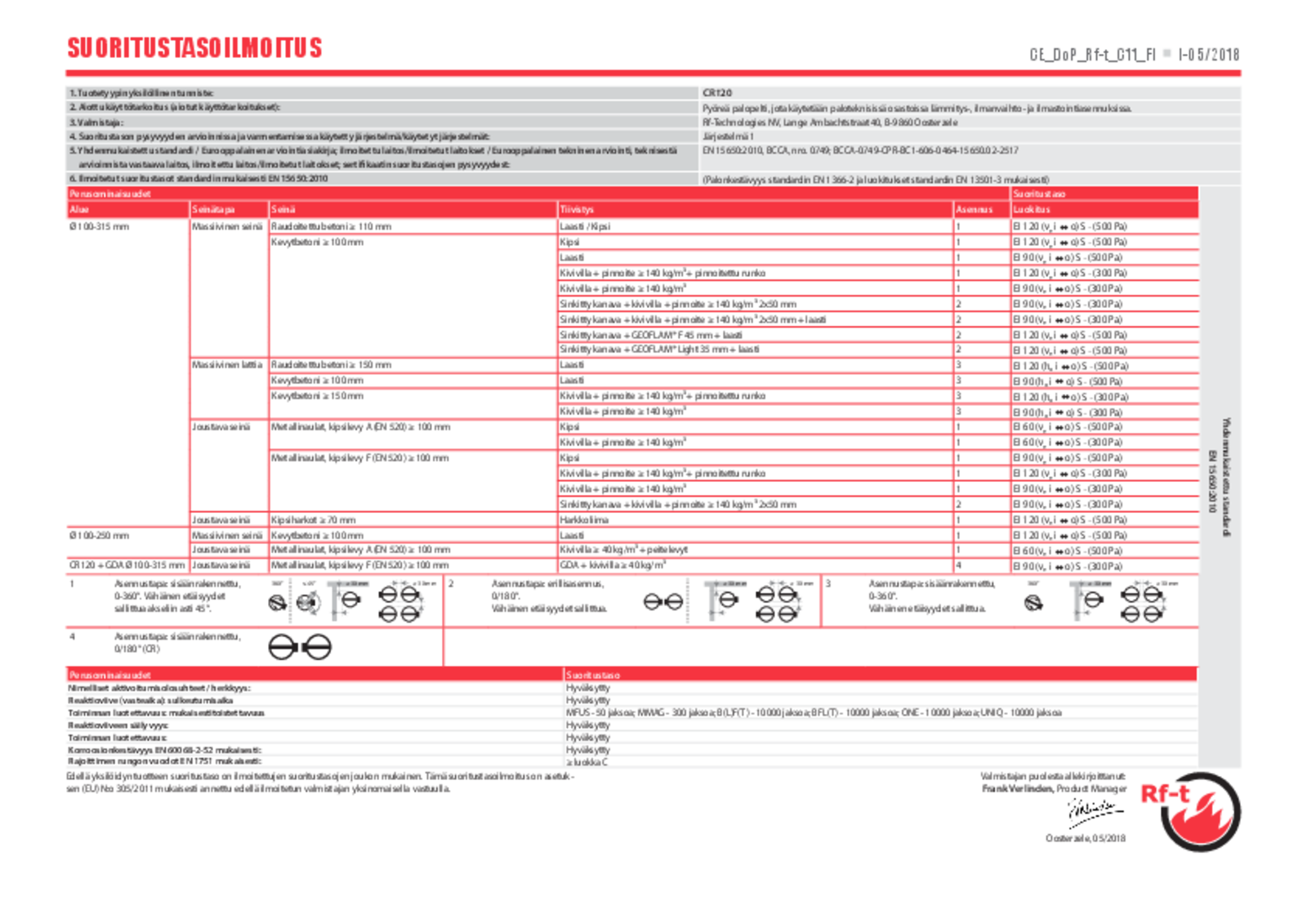 - CR120 on palo-/palokaasupelti paloluokissa EI60S-EI120S, jossa on pyöreä liitäntä Ø100–315 mm