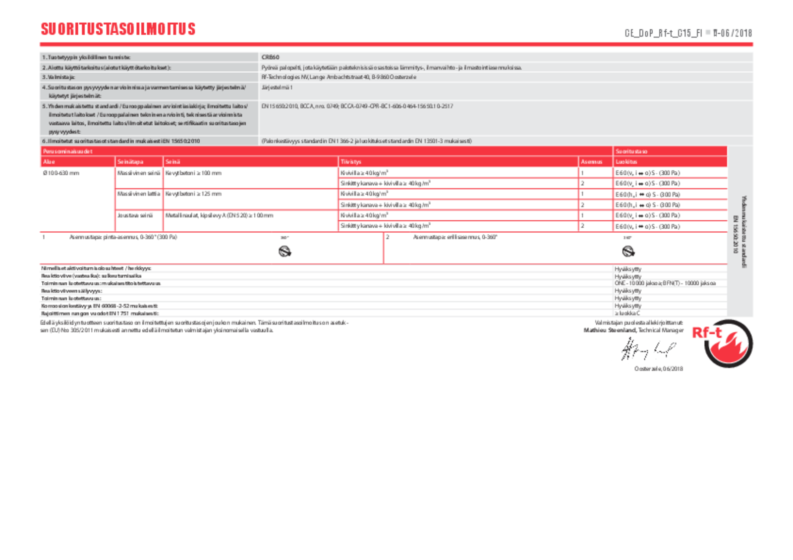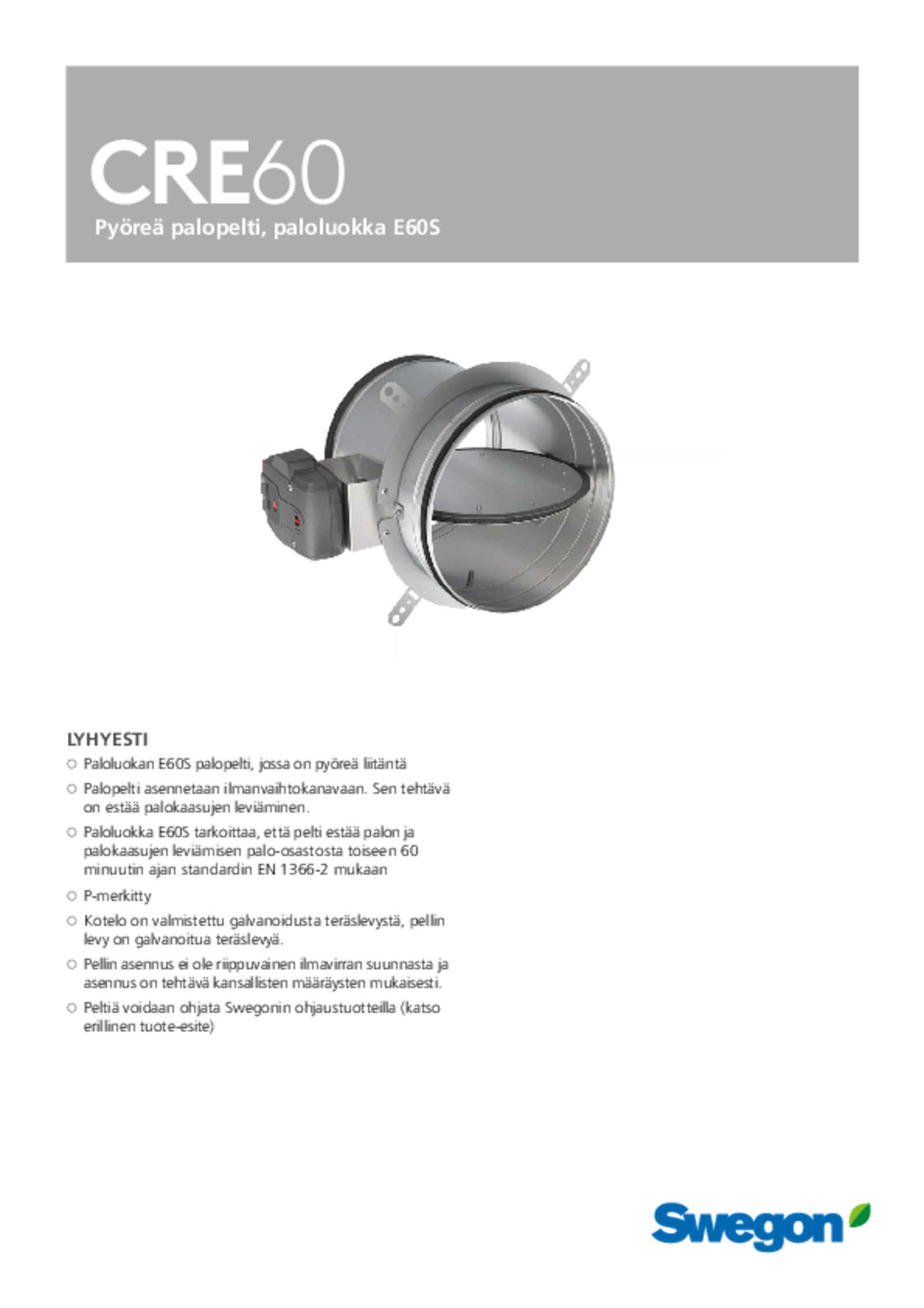 - CRE60 on palopelti paloluokassa E60S, jossa on pyöreä liitäntä Ø100–630 mm