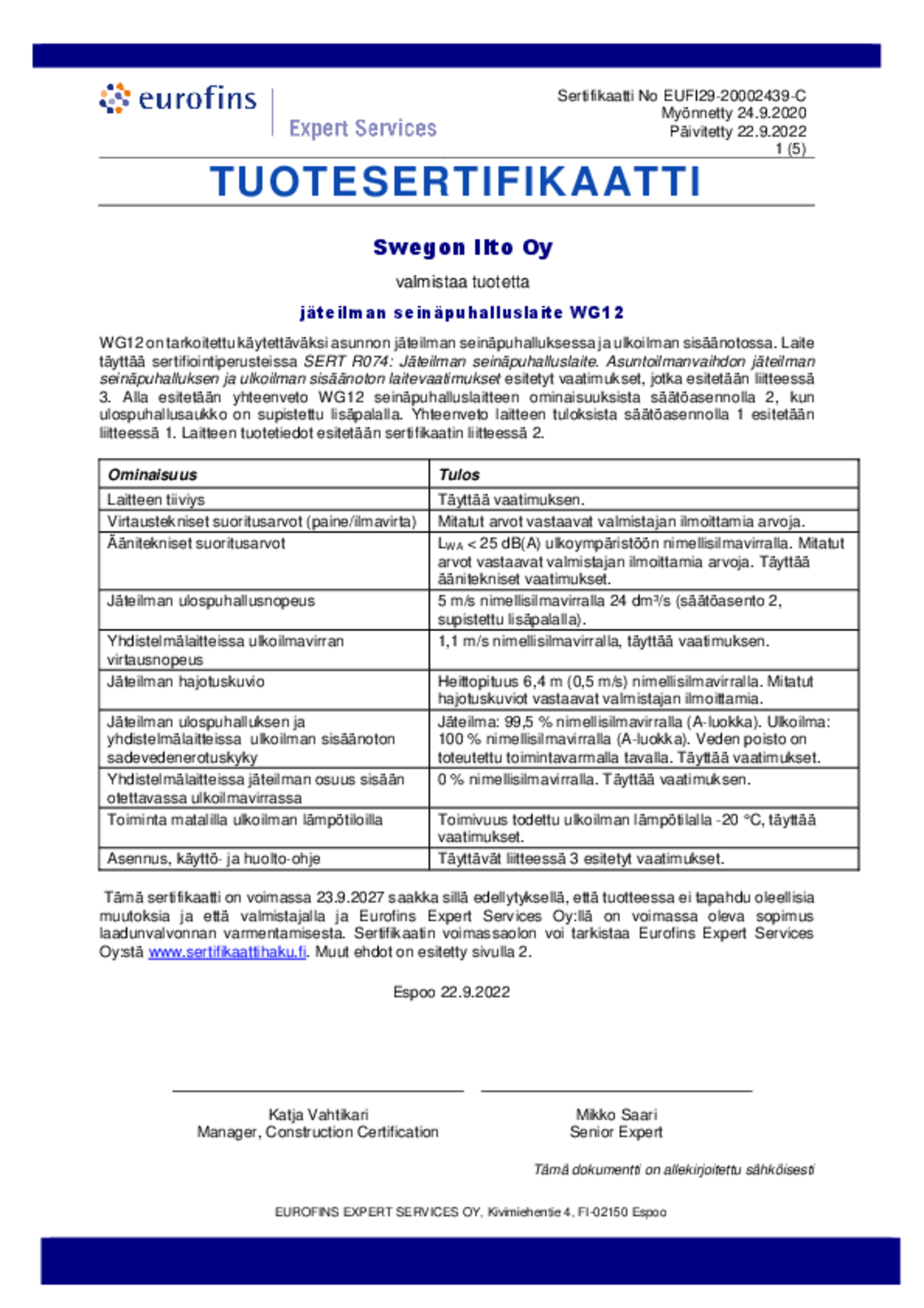 • Minimi painehäviö kun 5m/s ulospuhallusnopeus