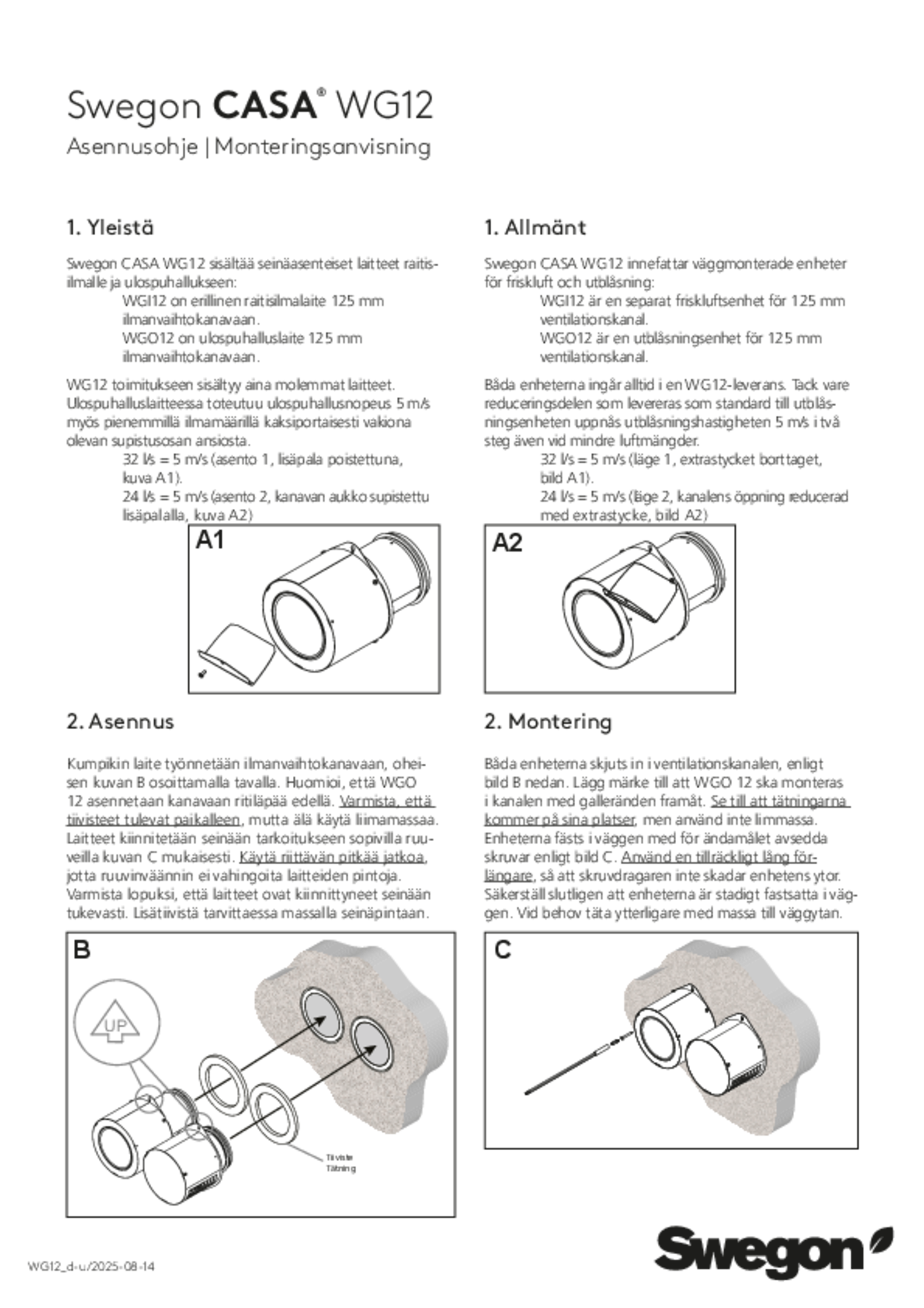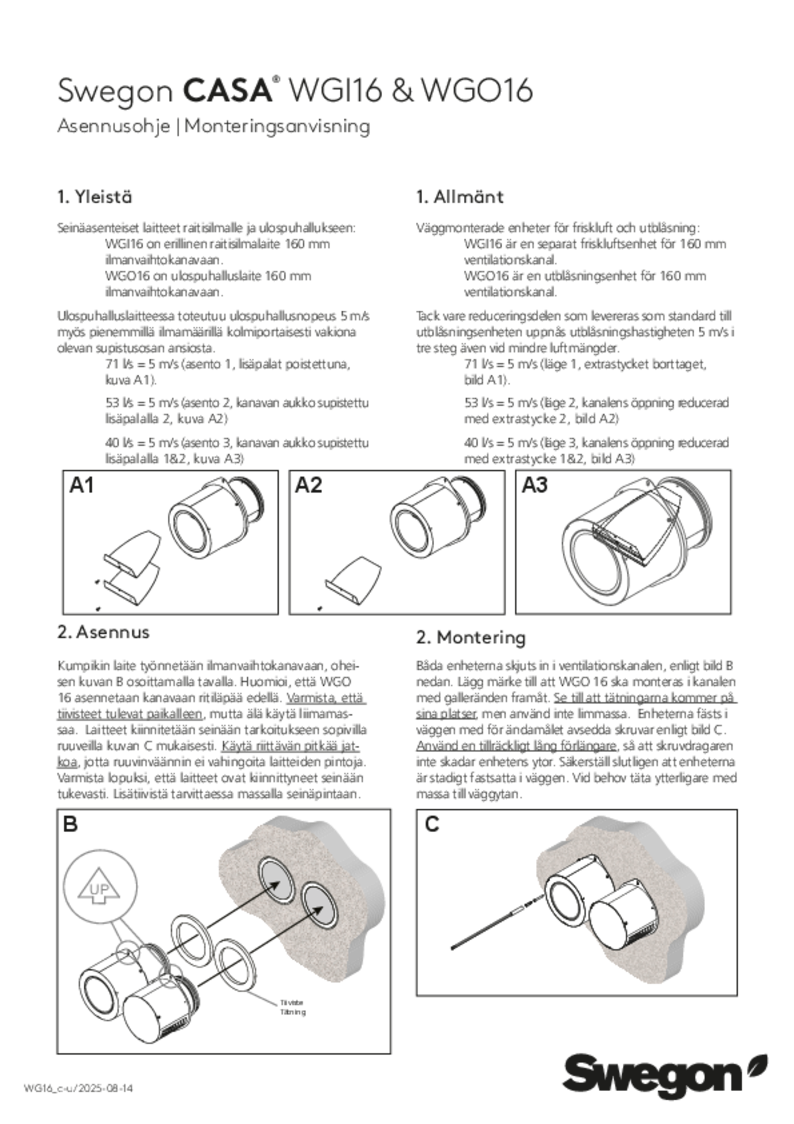 CASA WG12 ja WG16 päätelaitteet ovat kehitetty toimimaan yhdessä CASA Smart –ilmanvaihtokoneiden kanssa. Ne ovat säädettävissä eri olosuhteisiin sopivaksi ja varmistettu toimiviksi myös matalissa ulkolämpötiloissa