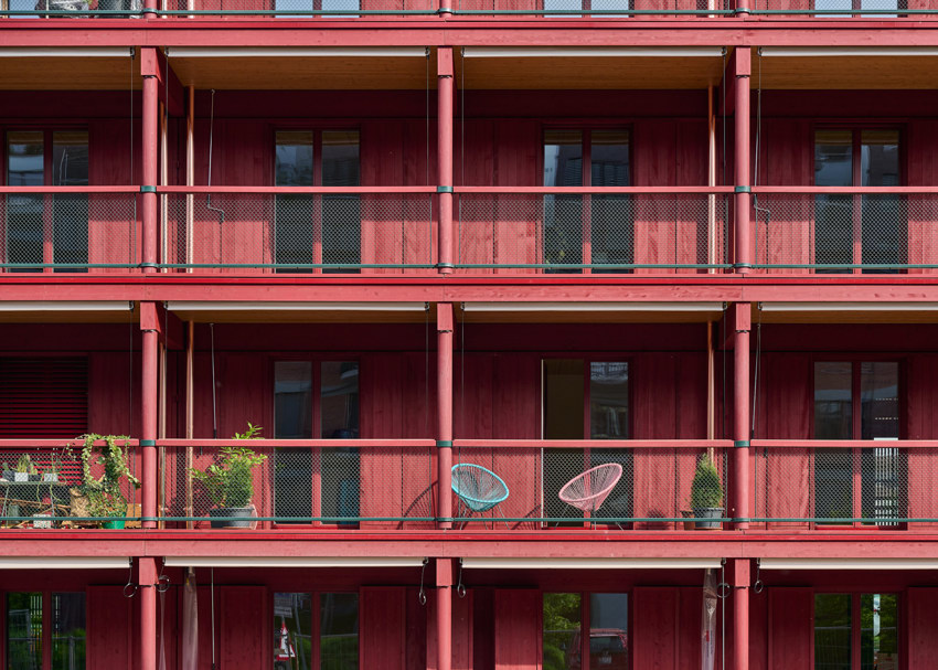 L'accès pergola aux appartements favorise les contacts sociaux. L'architecture en bois forme le cadre de vie expressif mais calme qui convient à la norme. Du sol au plafond, tout simplement magnifiques, les fenêtres en bois à double battant permettent à la lumière et à la chaleur d'inonder le sol, mais permettent également le recul nécessaire dans ce contexte urbain. Des plantes en pot, des hamacs et des meubles animent l'architecture de la véranda et confèrent à la forme légèreté, convivialité et confort.