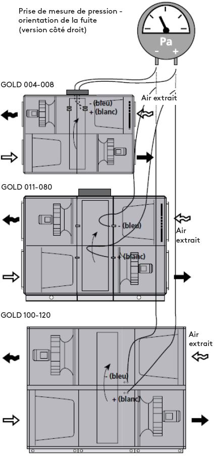 Raccorder un pressostat différentiel sur les prises de mesure de pression de la centrale (illustrations ci-dessous).