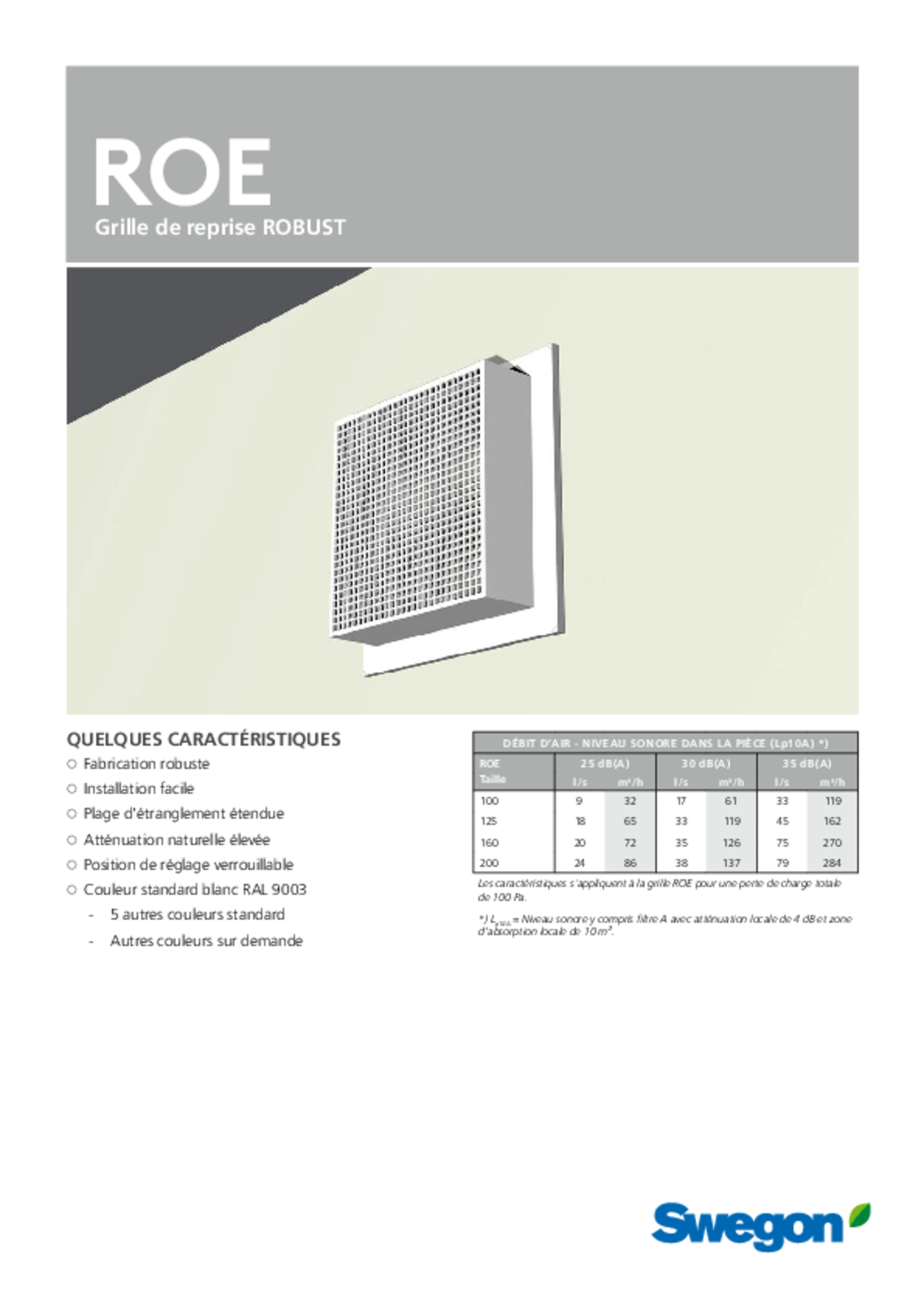 | Les caractéristiques s’appliquent à la grille ROE pour une perte de charges totale de 100 Pa. *) Lp10A = Niveau sonore y compris filtre A avec atténuation locale de 4 dB et zone d’absorption locale de 10 m². | |||||||