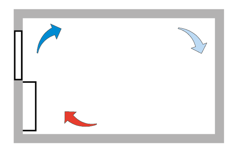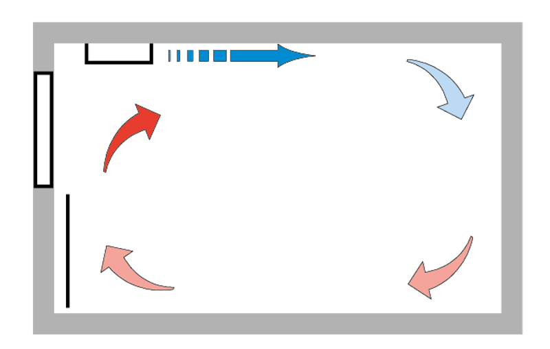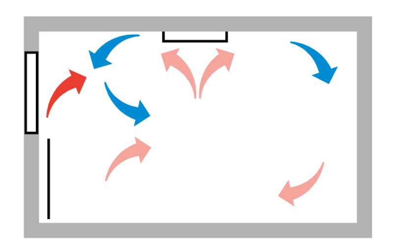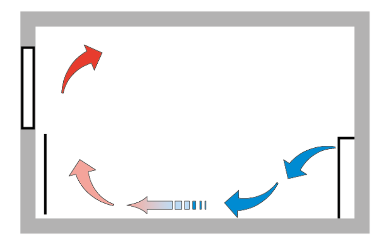 Cette configuration nécessite une vitesse de sortie élevée du diffuseur d'air de soufflage pour éviter de plonger dans la zone occupée. Il est important que tout rebord de fenêtre soit conçu de manière à ne pas diriger l'air dans la pièce.