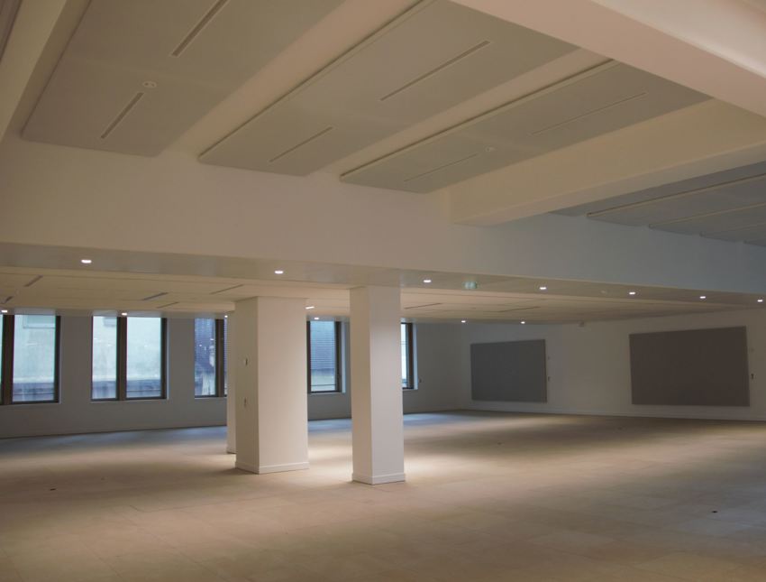Ce système permet de garantir une homogénéité au niveau des températures et outre leur qualité esthétique, leurs surfaces d’absorption phoniques permettent d’assurer une bonne acoustique dans les bureaux. L’éclairage a été intégré à ces plafonds pour un effet très design.