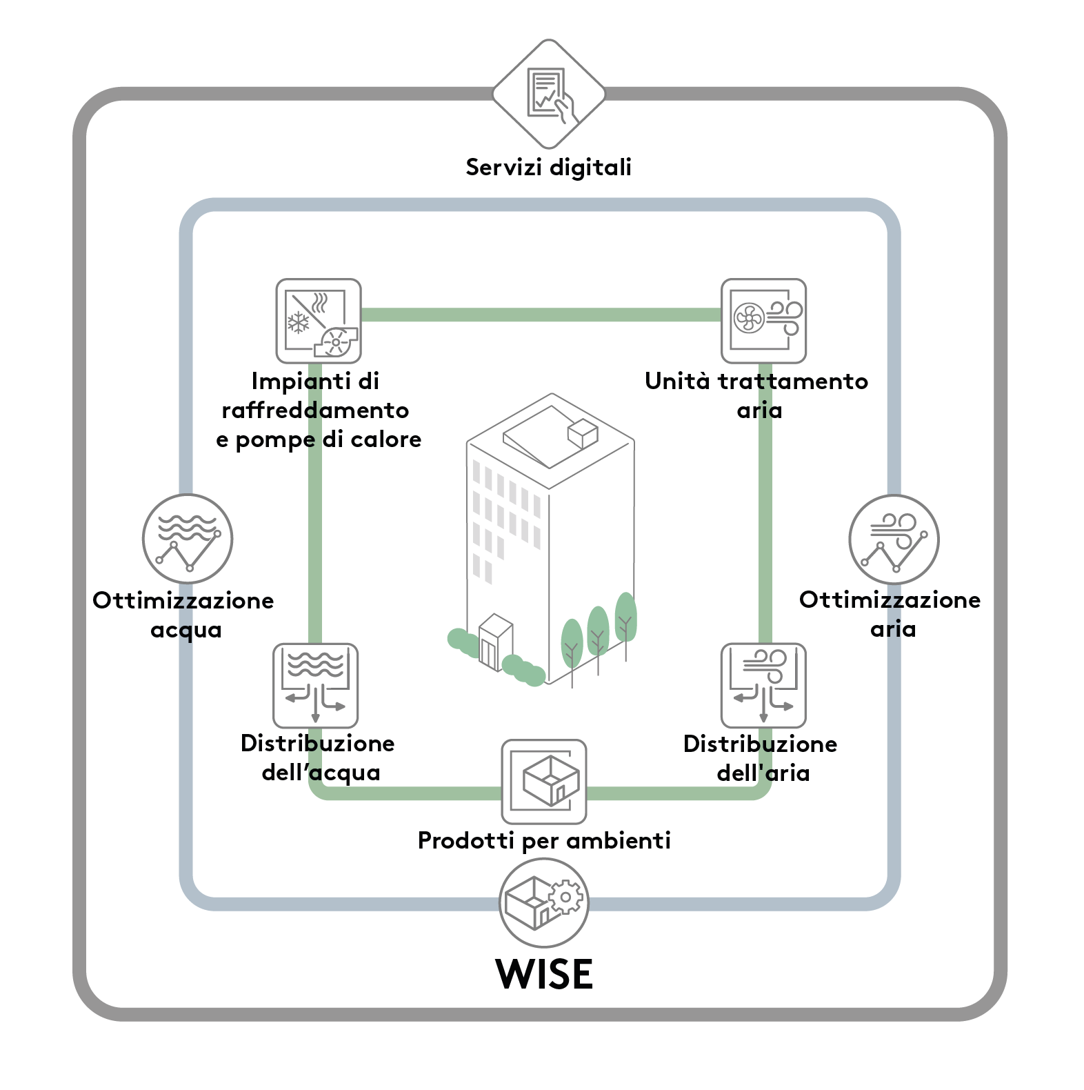 Utilizzando WISE in pratica, è possibile controllare tutti gli elementi in un sistema di climatizzazione, come ad esempio le unità di trattamento aria e i prodotti di climatizzazione. WISE può anche controllare l’ottimizzazione di aria e acqua. Inoltre è possibile aggiungere servizi digitali dai quali poter visualizzare e gestire i dati dei prodotti e delle proprietà.