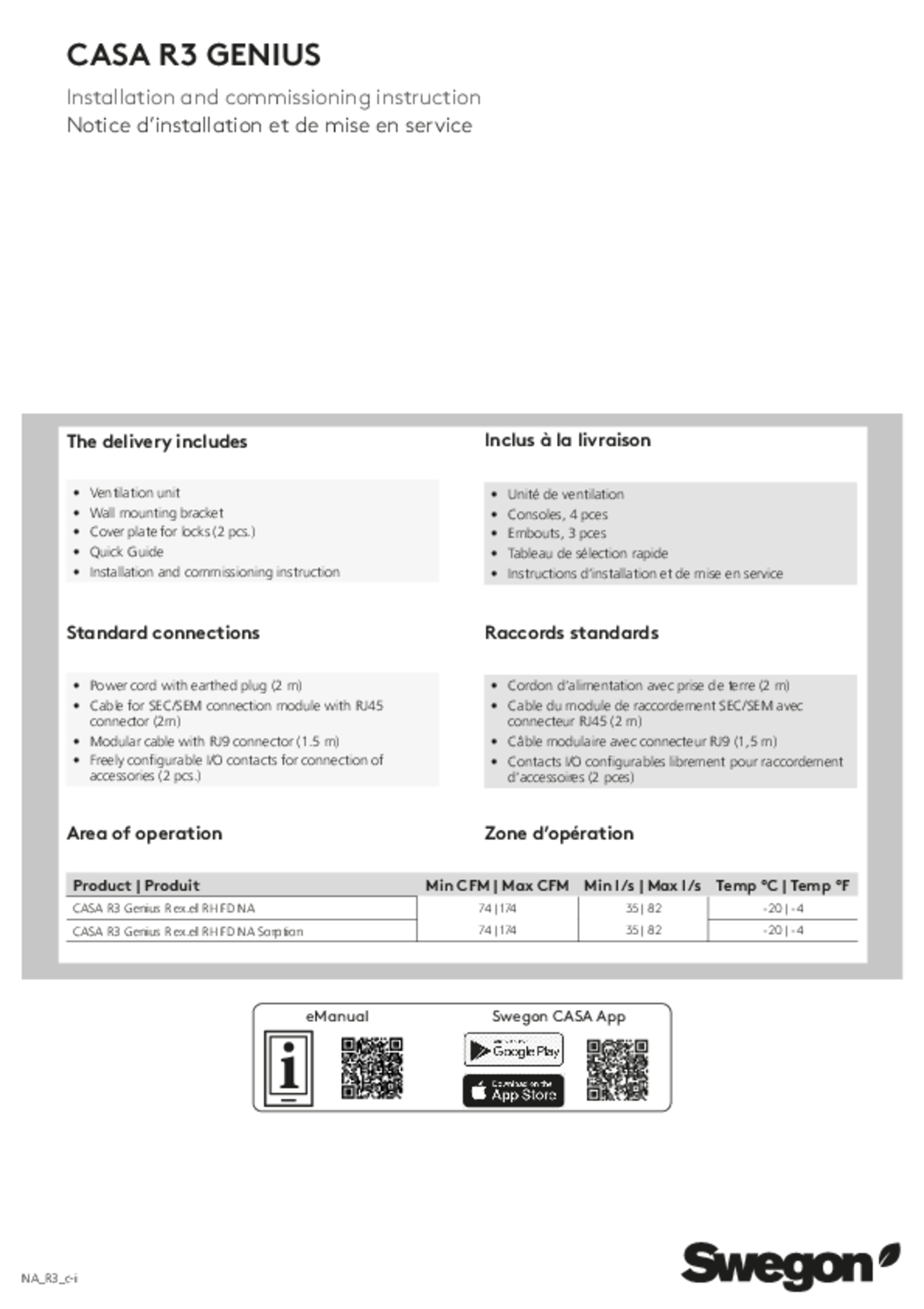 CASA R3 is a compact air handling unit with a rotary heat exchanger and controls, suitable for installation in the wall or ceiling and air flow rates of 53 - 170 CFM