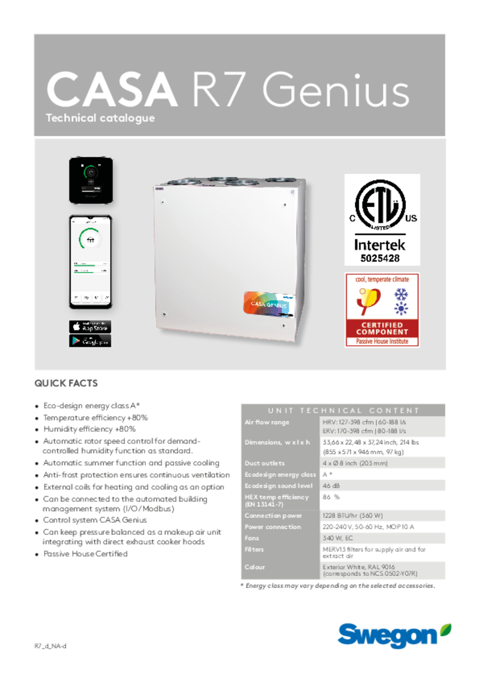| Swegon CASA R7 Genius Techincal Catalogue (pdf 5.85MB) | CASA Genius | Technical catalogue | |