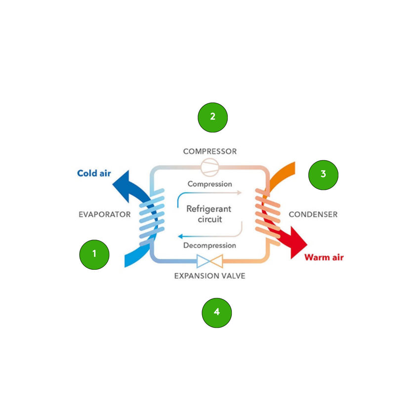 A refrigerant fluid, by changing its status (from liquid to gas and vice-versa), absorbs or releases energy. Heat pumps technology exploits this physical feature by manipulating the refrigerant pressure though four main devices components: