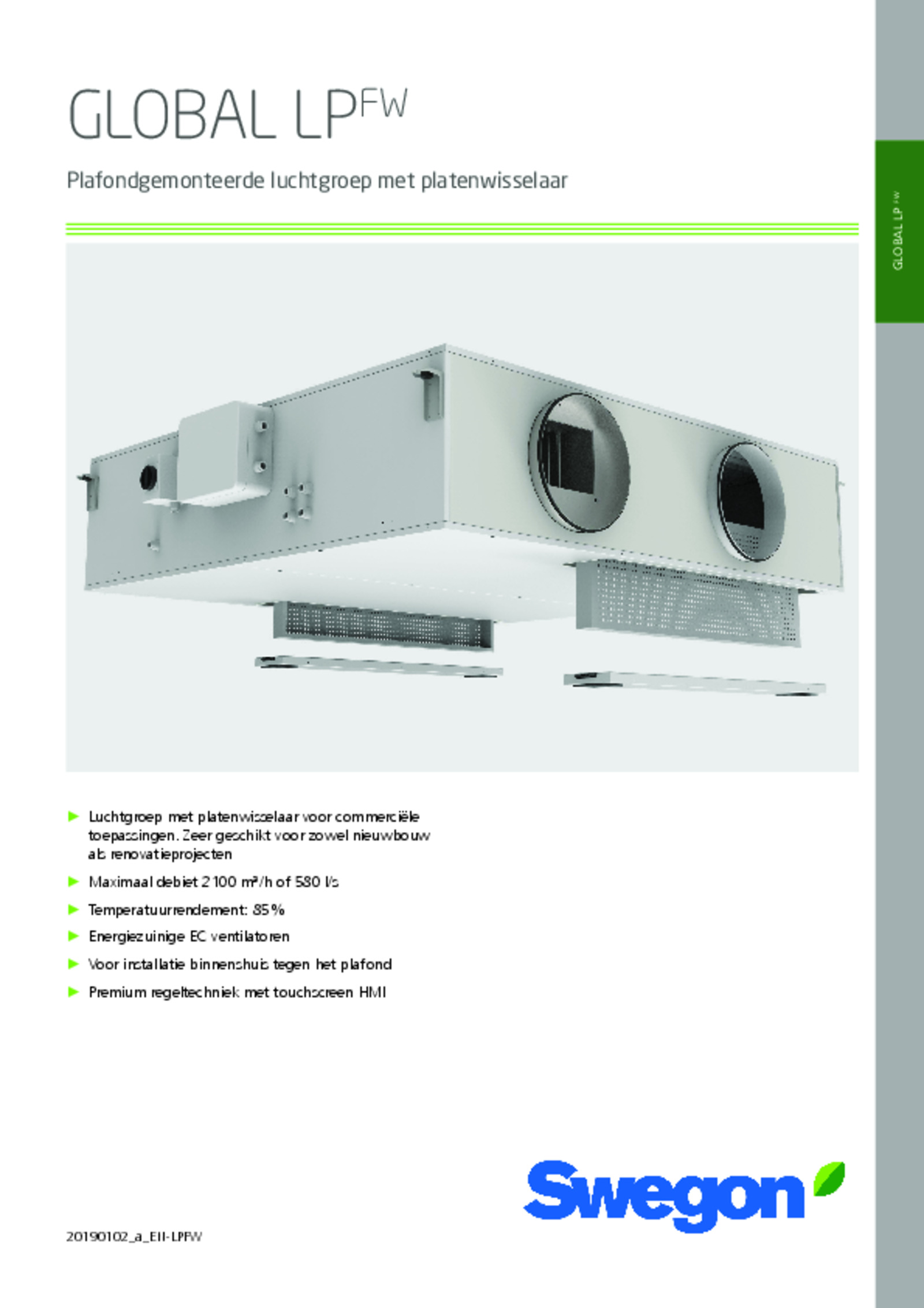Laagprofiel luchtgroep voor installatie binnenshuis, tegen het plafond of in een verlaagd plafond, voorzien van voorovergebogen schoepen en vouwfilters.
