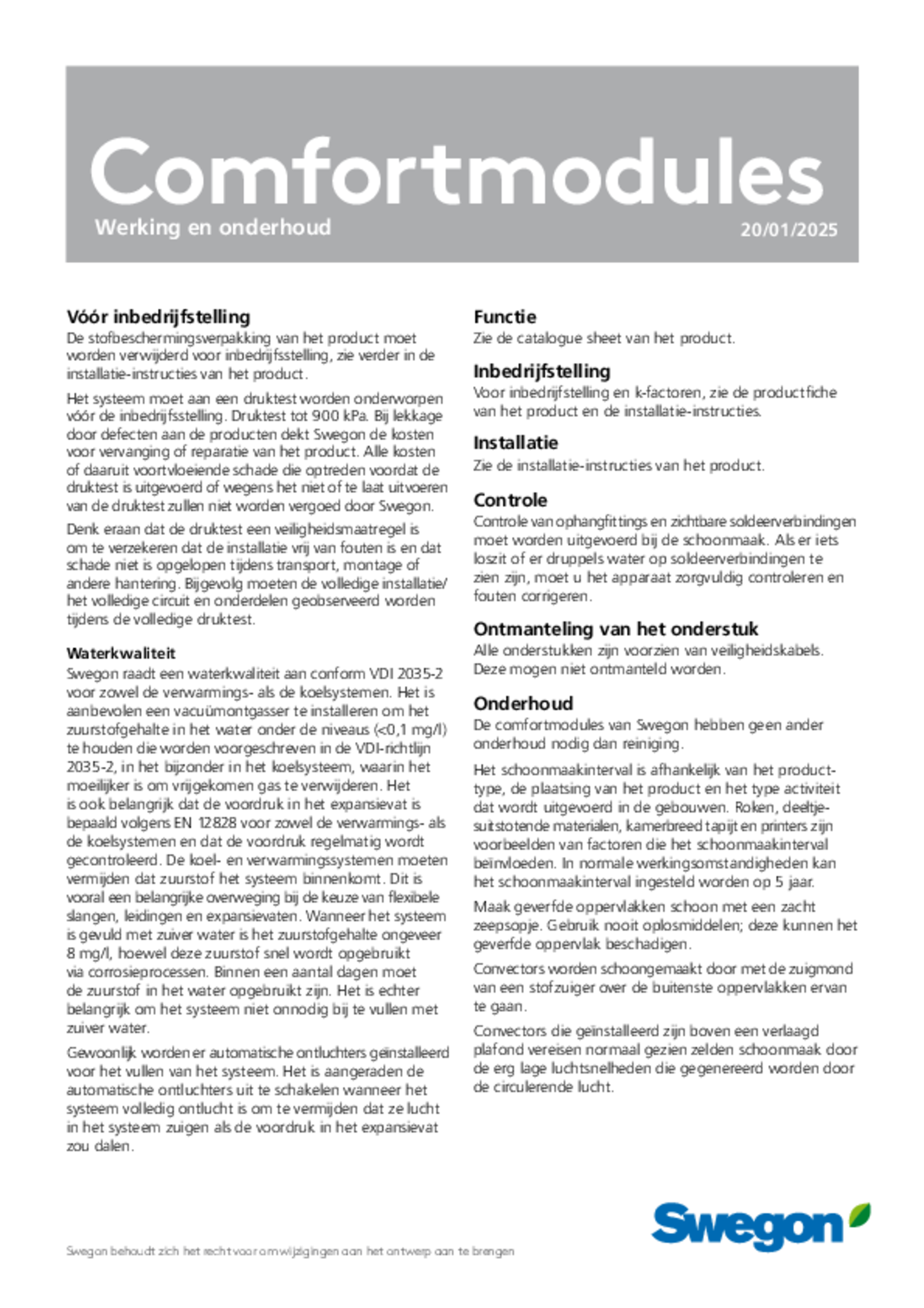 - Comfortmodule voor vraaggestuurd binnenklimaat, geïntegreerd in bedieningsplatform WISE van Swegon