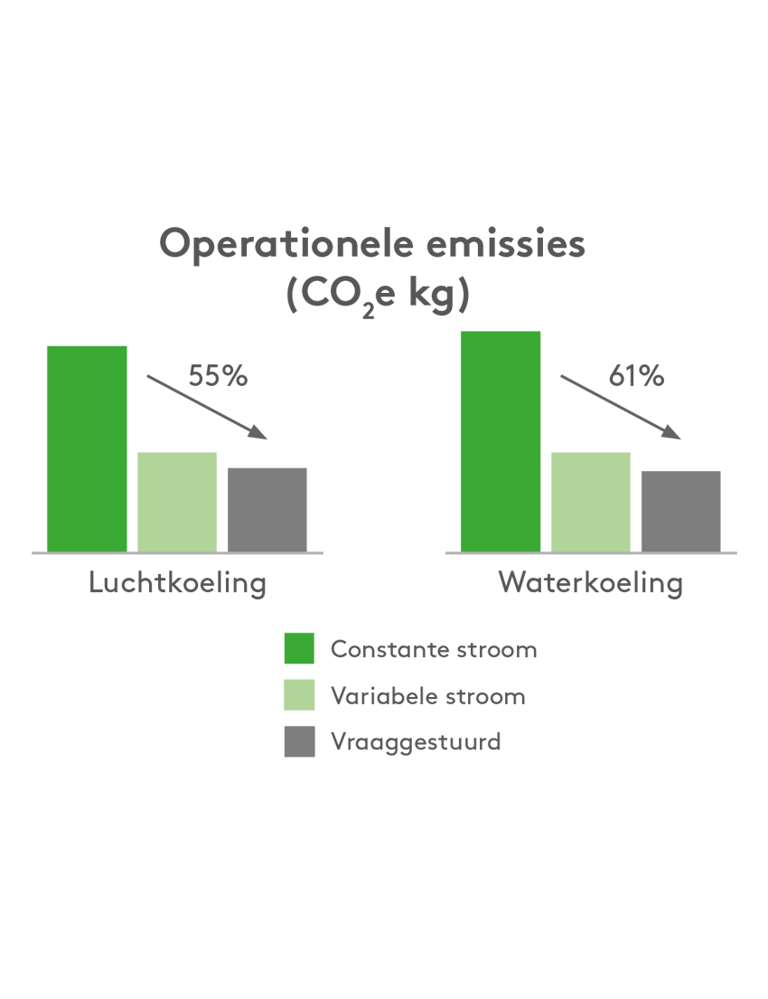 Minder energieverbruik betekent ook een lagere klimaatvoetafdruk. Met een vraaggestuurde oplossing kan de CO2-uitstoot met maximaal 61% worden verminderd, waardoor het een effectieve manier is om bij te dragen aan een duurzamere toekomst.