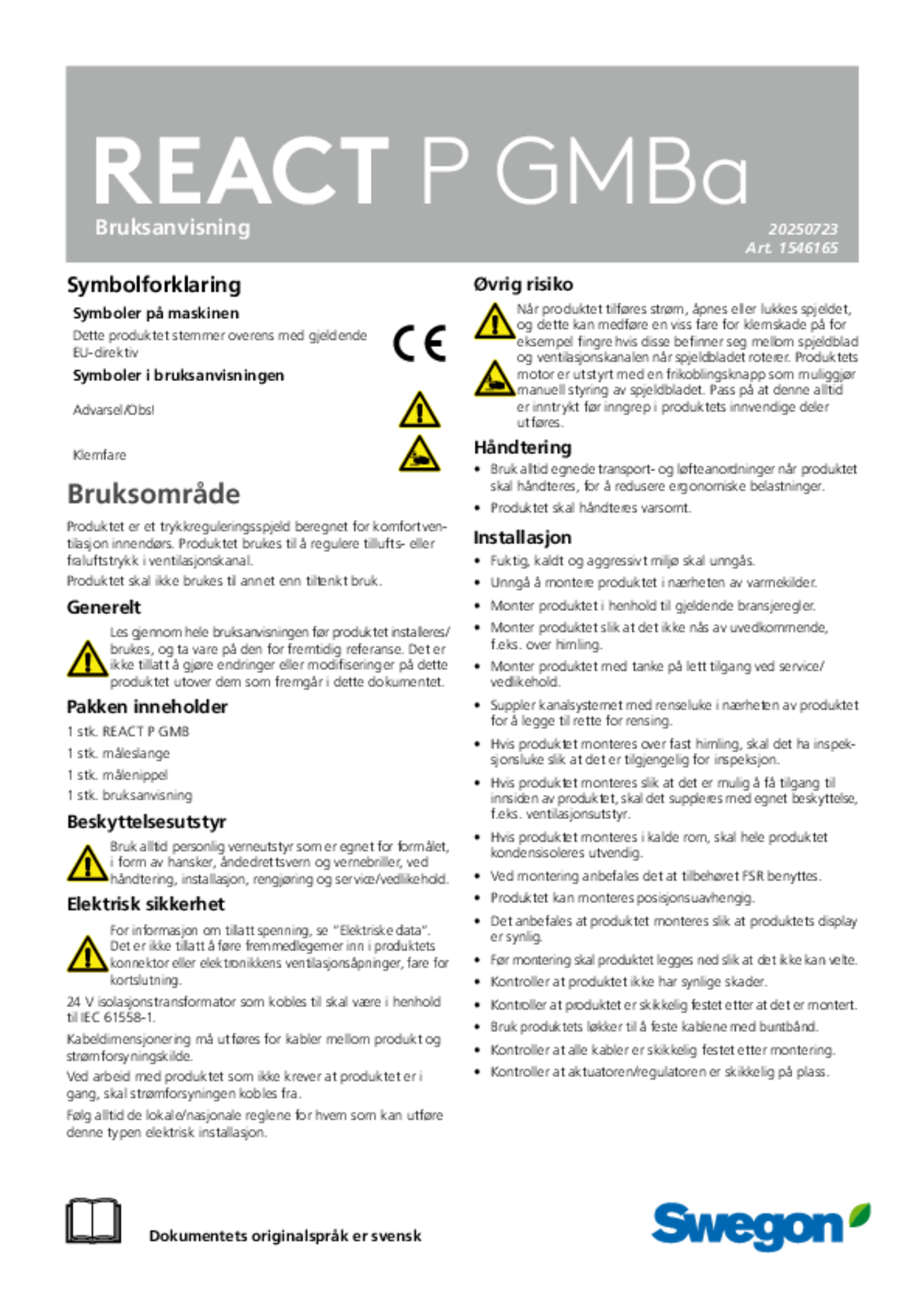 - Beregnet for trykkstyring av komfortventilasjon.