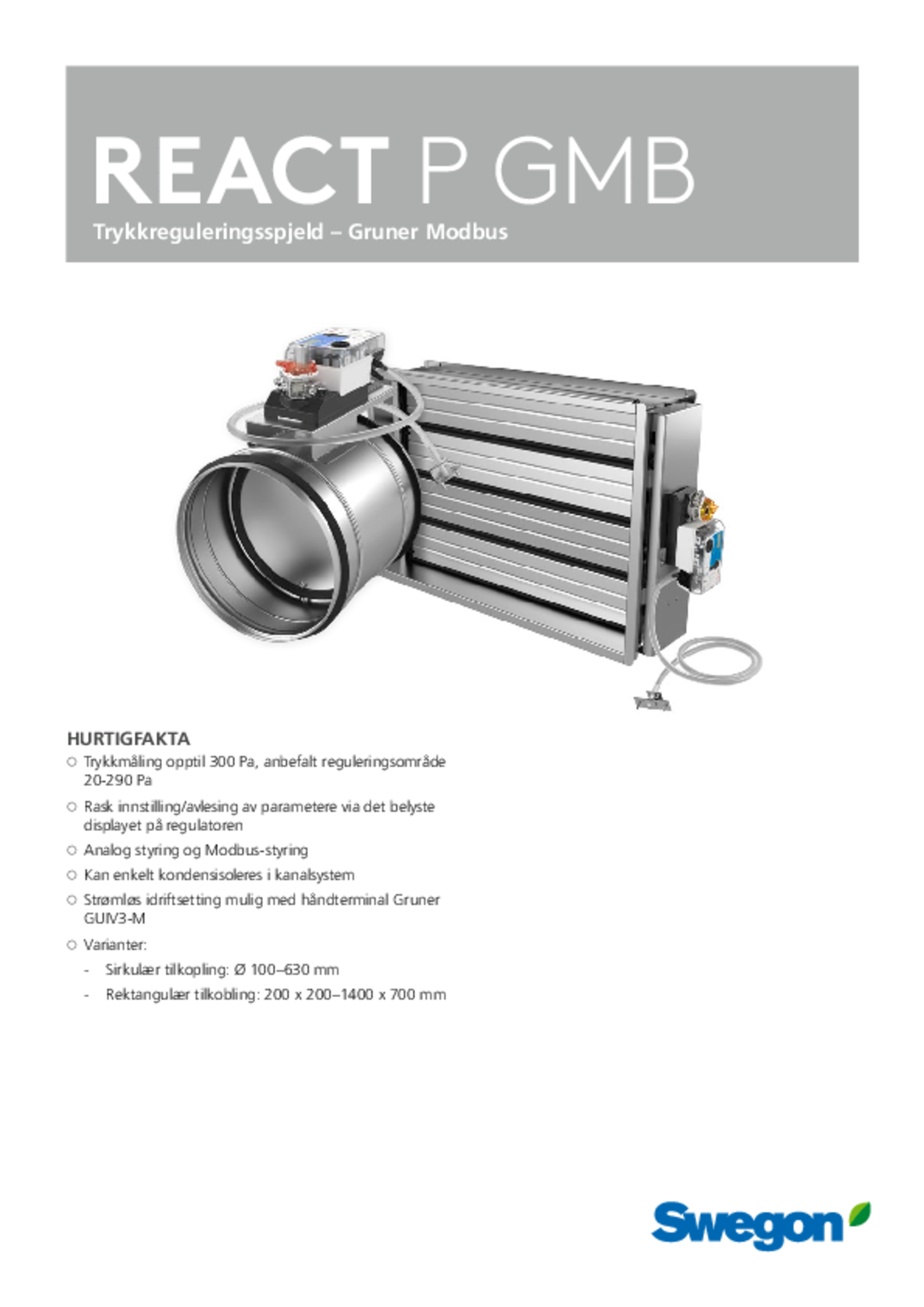 - Trykkmåling opptil 300 Pa, anbefalt reguleringsområde 20-290 Pa