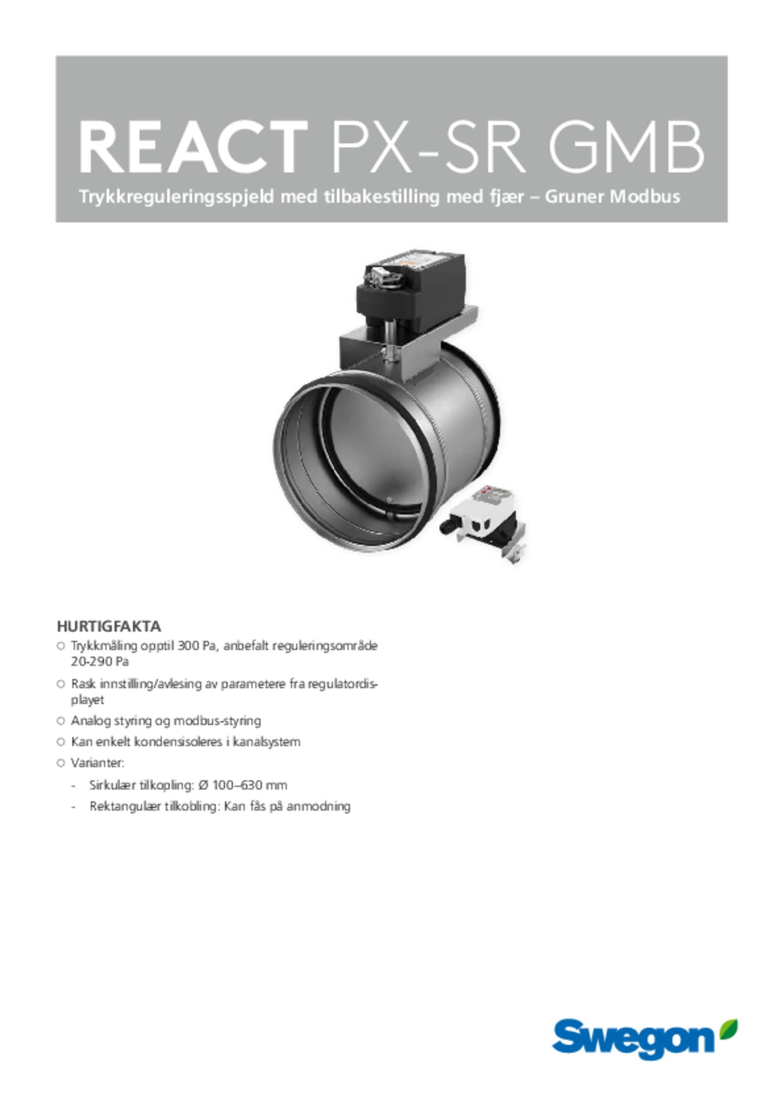 - Trykkmåling opptil 300 Pa, anbefalt reguleringsområde 20-290 Pa