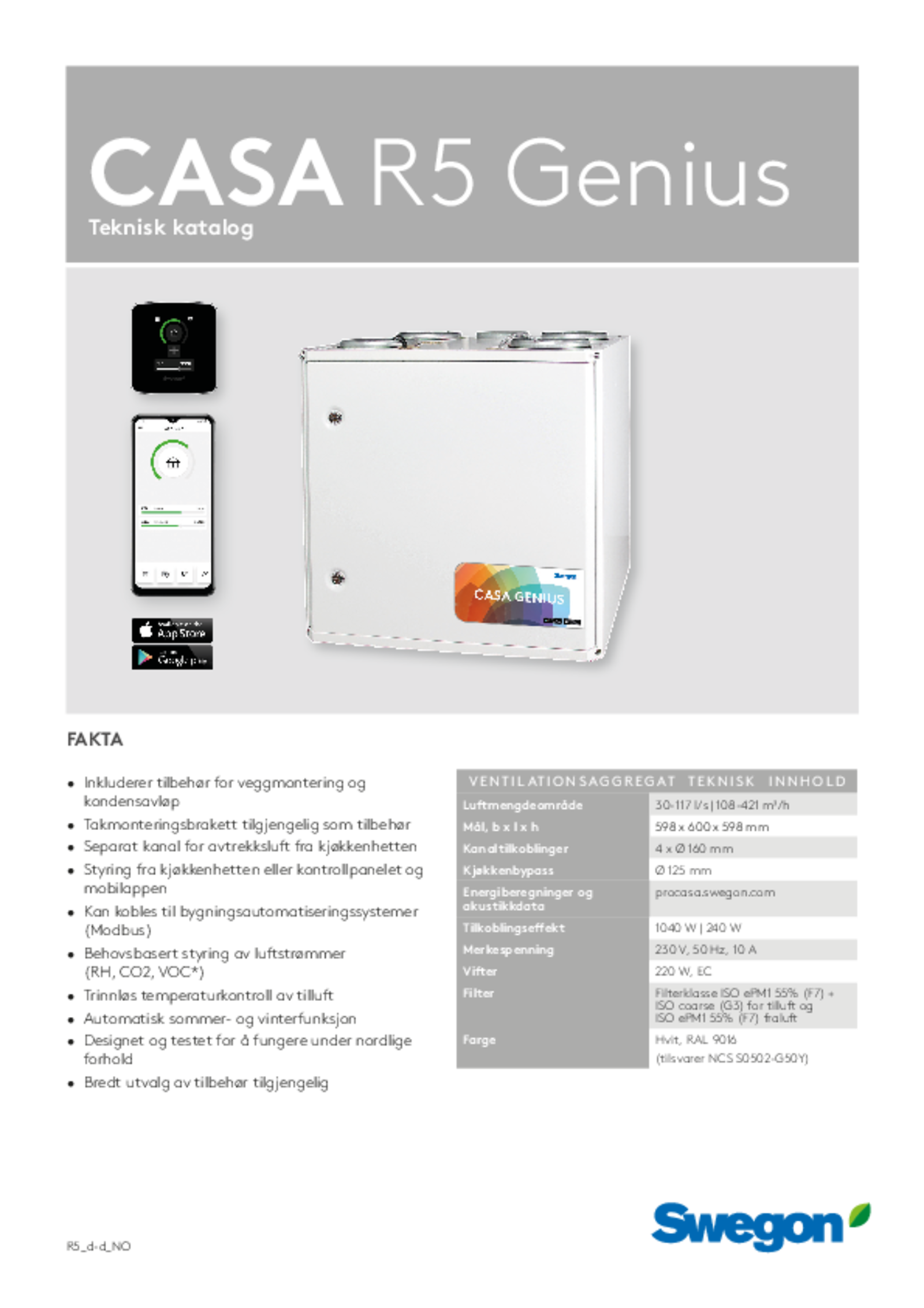 | CASA R5 Smart R RH | 108-421 | A | 4 x Ø 160 mm 1 x 125 mm | 230 V / 10 A | 600 | 598 | 597 | 78 | |