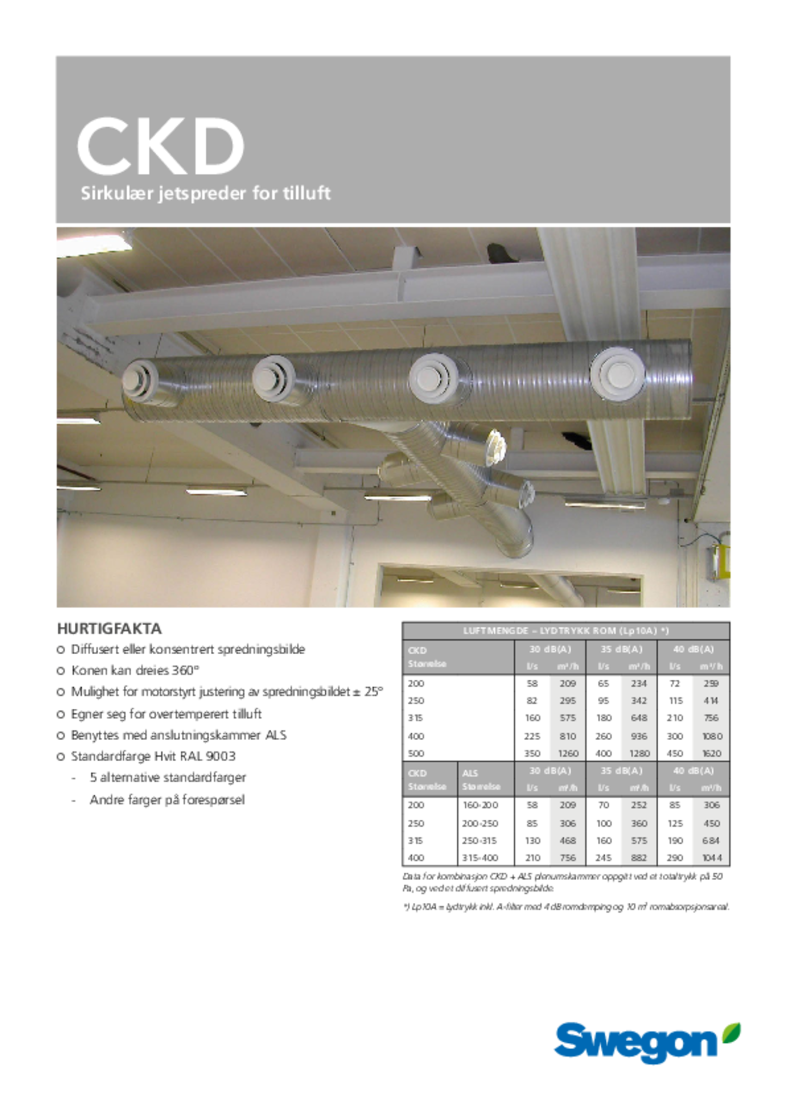 CKD er en sirkulær flerkonet jetspreder for vegg- eller takmontering. Den tåler ekstremt store luftmengder ved lavt lydnivå. Passer til konstant eller variabel luftmengde. Kan brukes til under- eller overtemperert tilluft og både horisontalt og vertikalt spredningsbilde er mulig. Passer til både komfort- og industrianlegg.