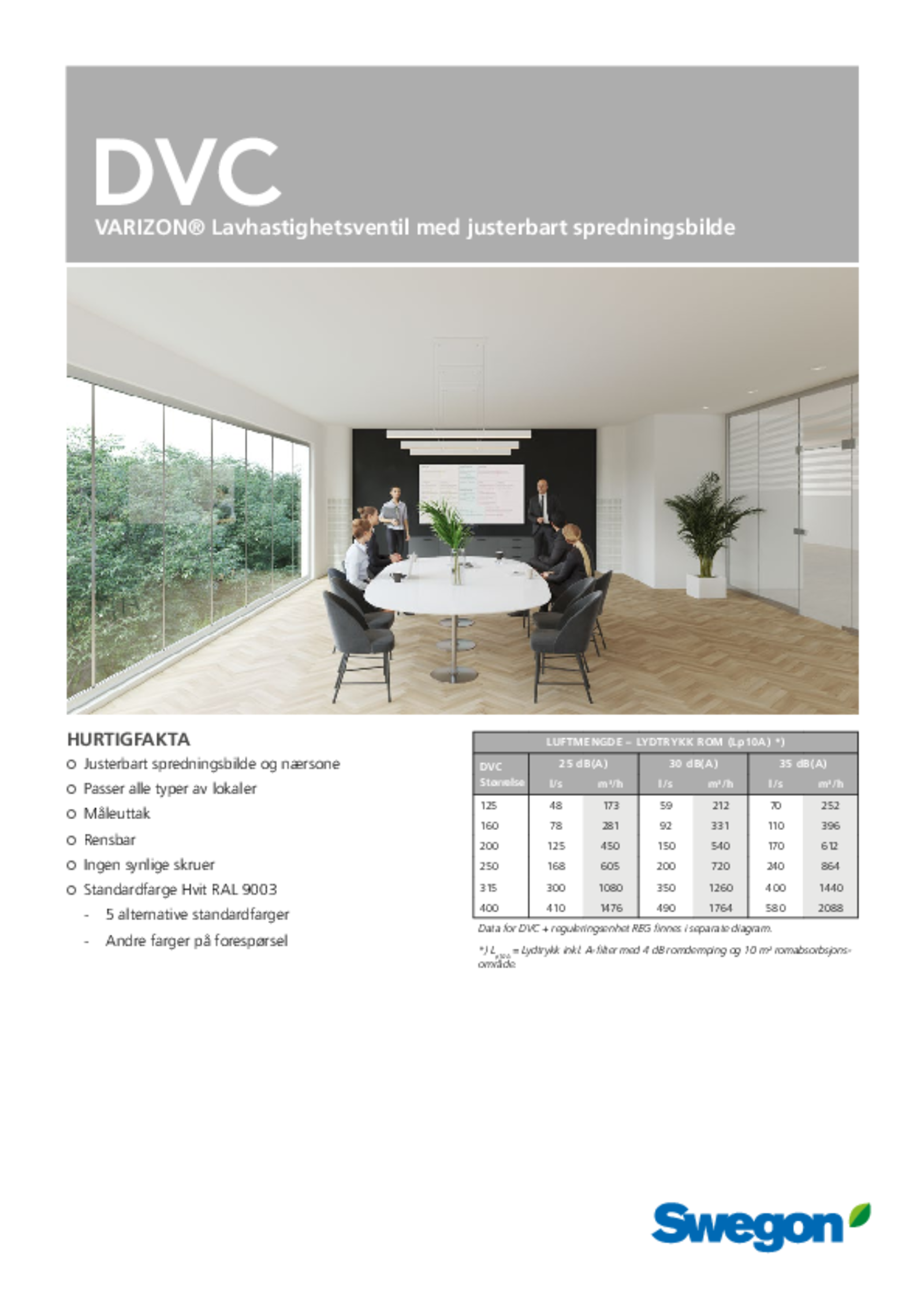 DVC er en komplett, kvartrund lavhastighetsventil for veggmontering, som tilfører luft med lav hastighet til oppholdssonen. Spredningsbildet kan enkelt reguleres, takket være ventilens dreibare dyser. Tilbehør består av gulvsokkel, kanalinnkledning og reguleringsenhet.
