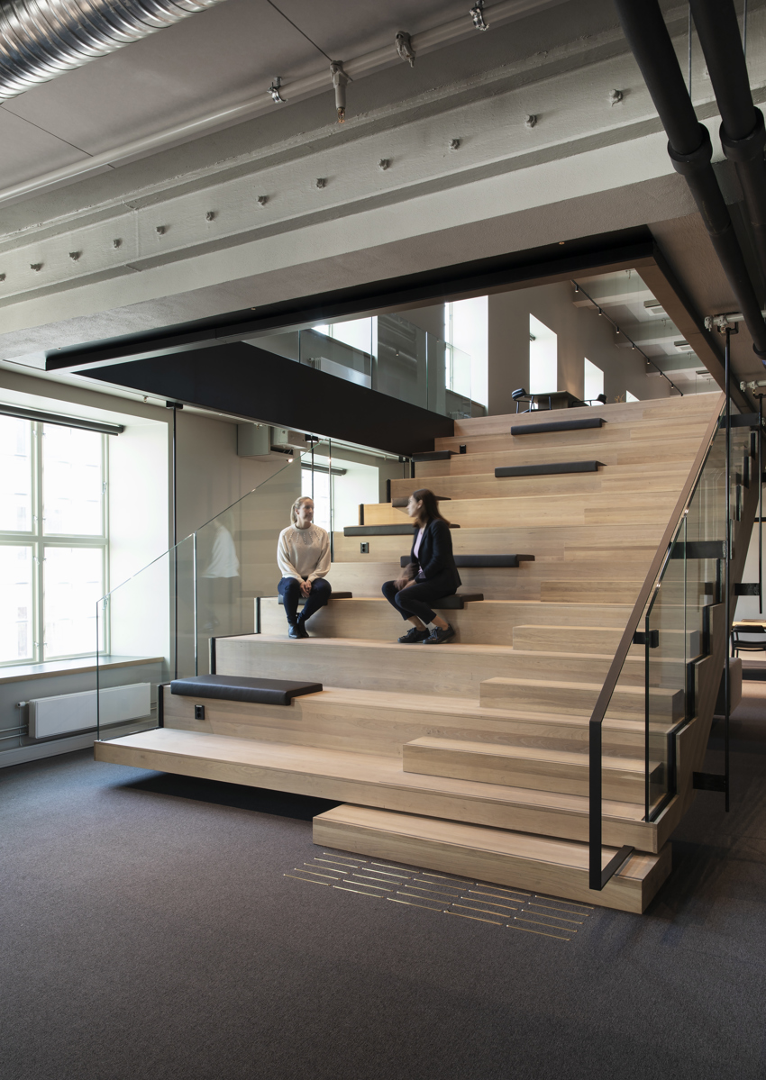 I bygningen er det en variasjon mellom lukket og åpen himling, der teknologien er fullt synlig. I taket er det blant annet benyttet komfortmodulen WISE Parasol EX og den aktive ventilen WISE Sphere Free. Leietaker har muligheten til å justere temperaturen til ønsket verdi via Wise RTA montert på vegg.