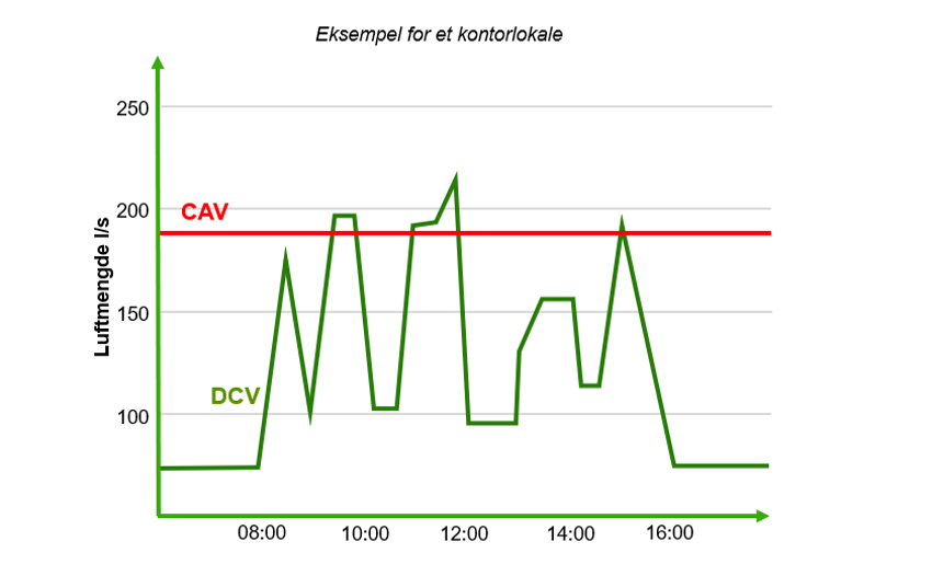 Grunnen til at luftmengden bør justeres er enkel. Det er ikke nødvendig å ventilere for fulle lokaler når de faktisk er tomme. Med CAV er luftmengden konstant og ofte satt høyt for å unngå for lite lufttilførsel når rommet er fullt. Dette betyr selvsagt at det tilføres samme mengde luft selv om rommet er helt tomt. Løsningen på dette kalles behovsstyrt ventilasjon. VAV og DCV er to typer behovsstyrte systemer som hjelper deg med å spare energi.