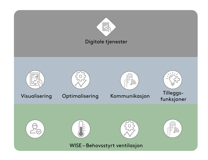 Det grunnleggende formålet med WISE er å tilpasse inneklimaet akkurat til ønsket nivå. Det ventilerer, kjøler og varmer verken for mye – som koster energi – eller for lite – som påvirker komforten negativt, men bare så mye som er nødvendig. Med WISE kombineres høy energieffektivitet, optimalisert drift, et ideelt inneklima og full oversikt over hele systemet.​