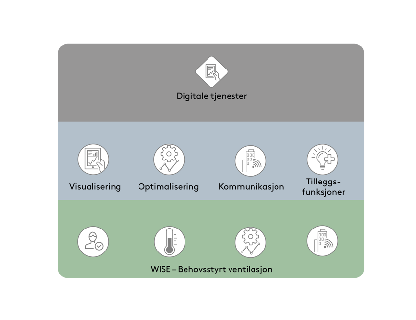 ​I WISE inngår alltid en basispakke til et behovsstyrt inneklima. I tillegg til basispakken finnes det en rekke løsninger som kan legges til, som visualisering, optimalisering, kommunikasjon og forskjellige funksjoner. I tillegg kan også en rekke digitale tjenester legges til:​