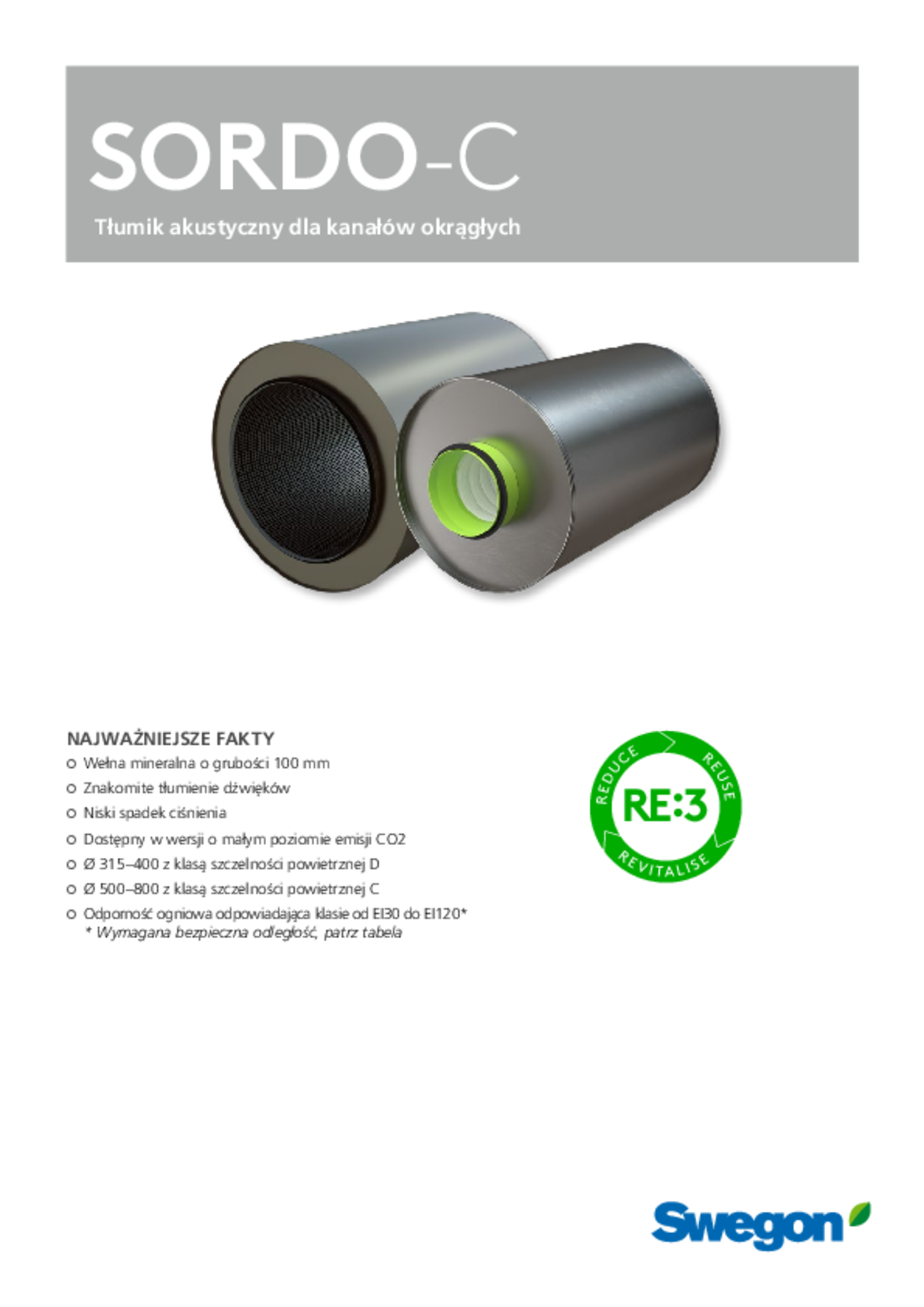 Model SORDO-C stanowi element koncepcji RE:3 firmy Swegon, opartej na kluczowych zasadach gospodarki obiegu zamkniętego, na którą składają się RE:duce, RE:use i RE:vitalise. Model SORDO-C o wym. od 100 do 400 jest wykonany z wytwarzanej w sposób zrównoważony blachy o nazwie RRP, co oznacza „recycled and renewably produced” (pochodzące z recyklingu i wytwarzane ze źródeł odnawialnych). Zawartość stali pochodzącej z recyklingu wynosi co najmniej 75 procent. Co więcej, w procesie produkcji stosuje się piece łukowe wykorzystujące wyłącznie energię ze źródeł odnawialnych.
