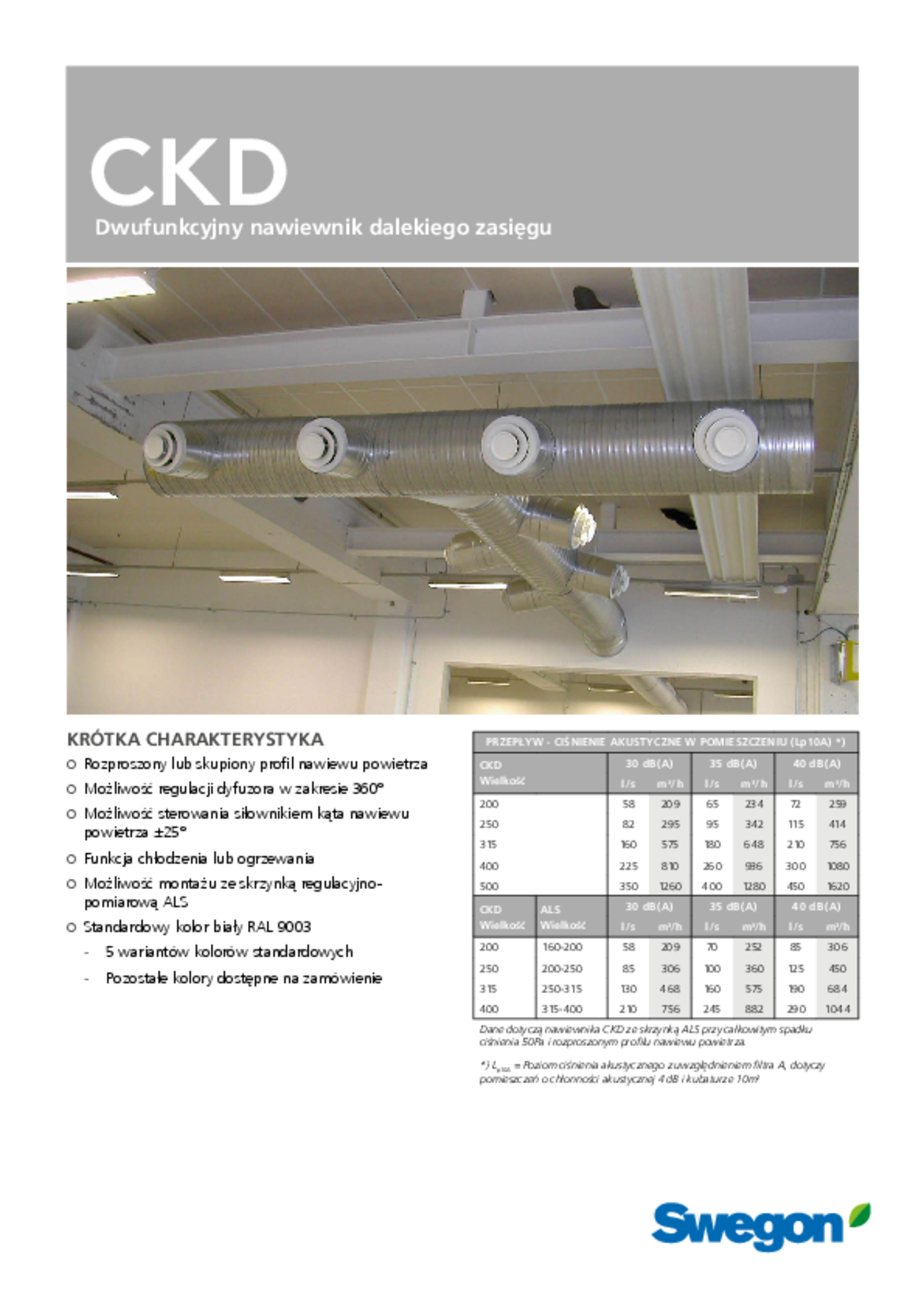 CKD to okrągły nawiewnik dalekiego zasięgu, przeznaczony do montażu w pozycji pionowej i poziomej. Umożliwia bardzo duży przepływ powietrza przy niskim poziomie hałasu. Do stałego lub zmiennego przepływu powietrza. Może być dostarczany w wersjach do niskich lub wysokich temperatur, ponadto możliwe są zarówno poziome, jak i pionowe profile wypływu. Nadaje się zarówno do budynków użyteczności publicznej, poczekalni, lotnisk, audytoriów, jak i dużych hal przemysłowych oraz sportowych.