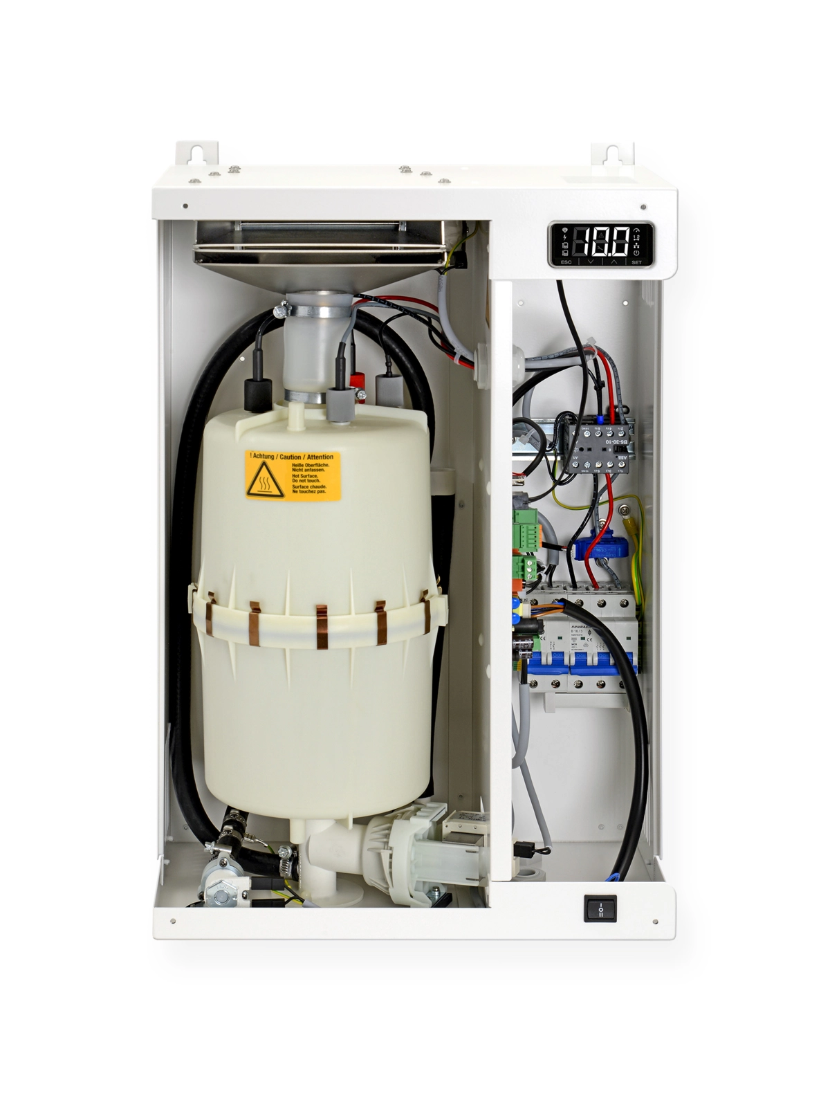 Nawilżacz parowy Mini Steam to najmniejszy z rodziny elektrycznych nawilżaczy parowych. Jest on przeznaczony do bezpośredniego nawilżania powietrza w pomieszczeniu i dostępny w dwóch wielkościach wydajności 5 i 10kg/h. Nawilżacz wyposażony jest w zintegrowany element nadmuchowy, który równomiernie rozprowadza parę po pomieszczeniu. Może być stosowany do nawilżania również w pomieszczeniach bez systemu klimatyzacji. Obudowa MiniSteam MSE wykonania jest z odpornej na korozję stali i dodatkowo malowana proszkowo. Nawilżacz wyposażony jest w czytelny wyświetlacz LED, dzięki któremu jest ciągły dostęp do informacji o urządzeniu i przebiegu procesu nawilżania. Proste symbole na wyświetlaczu zapewniają przejrzystość, a przyciski sterujące umożliwiają szybką i intuicyjną nawigację po menu.