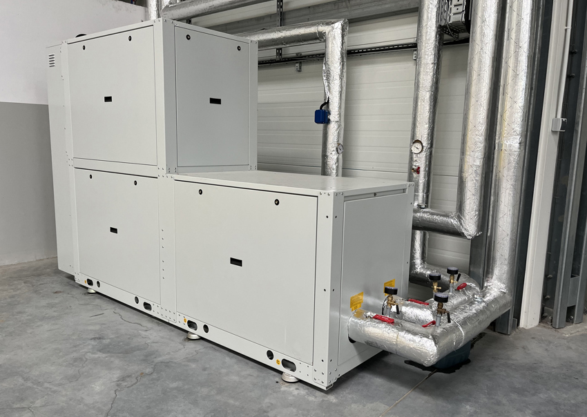 AnalizujÄ…c bilans energetyczny caÅ‚ego ukÅ‚adu zdecydowaliÅ›my o zastosowaniu jednostki multifunkcyjnej dziaÅ‚ajÄ…cej w systemie 4-rurowym, która umożliwia niezależnÄ… produkcje ciepÅ‚a i chÅ‚odu. Jednostka zostaÅ‚a połączona z nagrzewnicÄ… wstÄ™pnÄ… w centrali wentylacyjnej tak aby umożliwiaÅ‚a odzyskiwanie ciepÅ‚a z procesu chÅ‚odzenia na potrzeby ukÅ‚adu wentylacji. Pozostałą ilość energii grzewczej potrzebnej do ogrzania powietrza pokrywa kotÅ‚ownia. Takie rozwiÄ…zanie daje elastyczność, ponieważ podczas braku zapotrzebowania na chÅ‚odzenie, jednostka ma możliwość pracy w trybie grzania jak powietrzna pompa ciepÅ‚a.