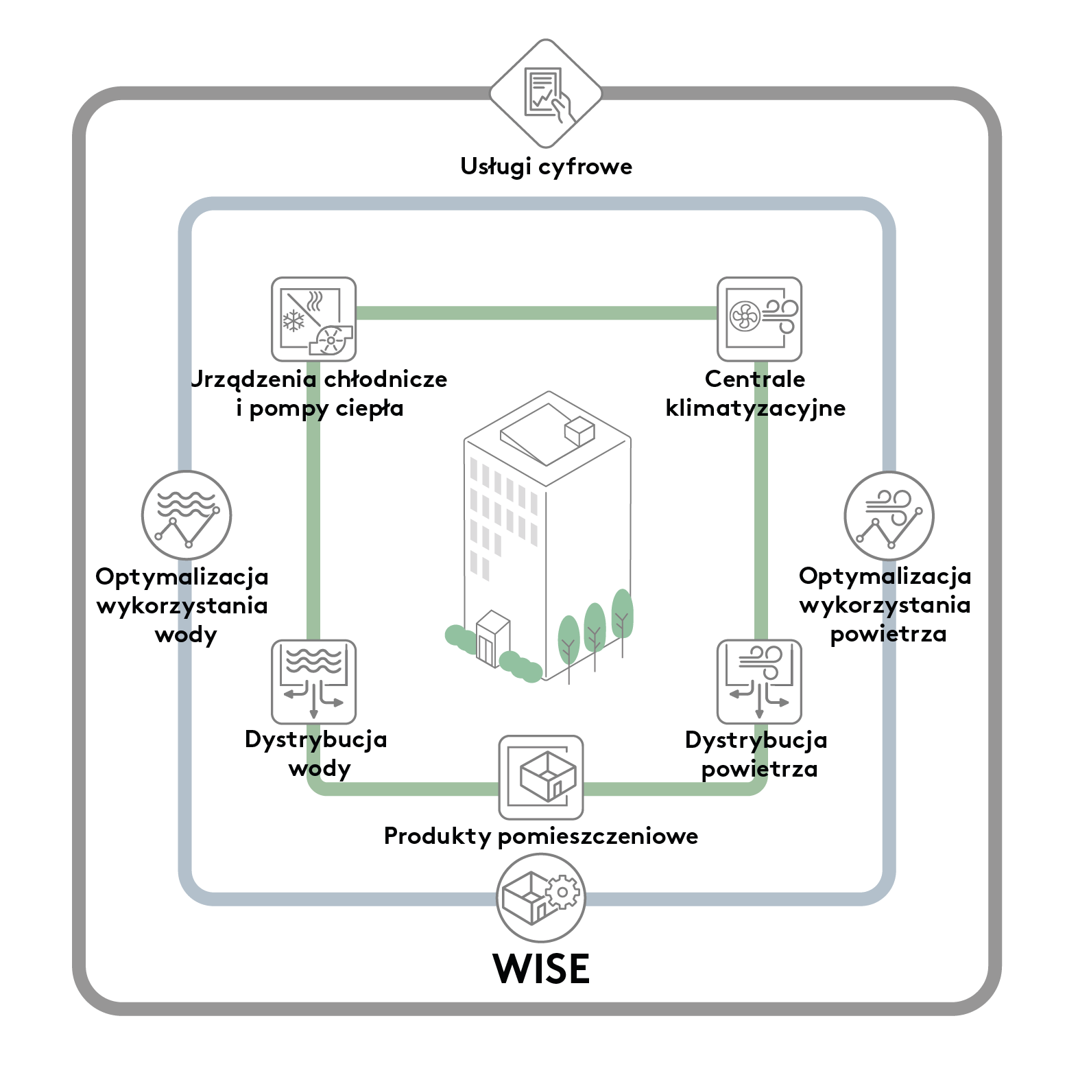 Za pomocą WISE możliwe jest sterowanie wszystkimi elementami systemu klimatyzacyjnego, takimi jak centrale klimatyzacyjne, moduły chłodzące i klimakonwektory indukcyjne. Ponadto WISE może sterować optymalizacją wody i powietrza. Opcjonalną funkcją jest także dodanie usług cyfrowych, w których można wizualizować dane produktów i ich właściwości oraz nimi zarządzać.
