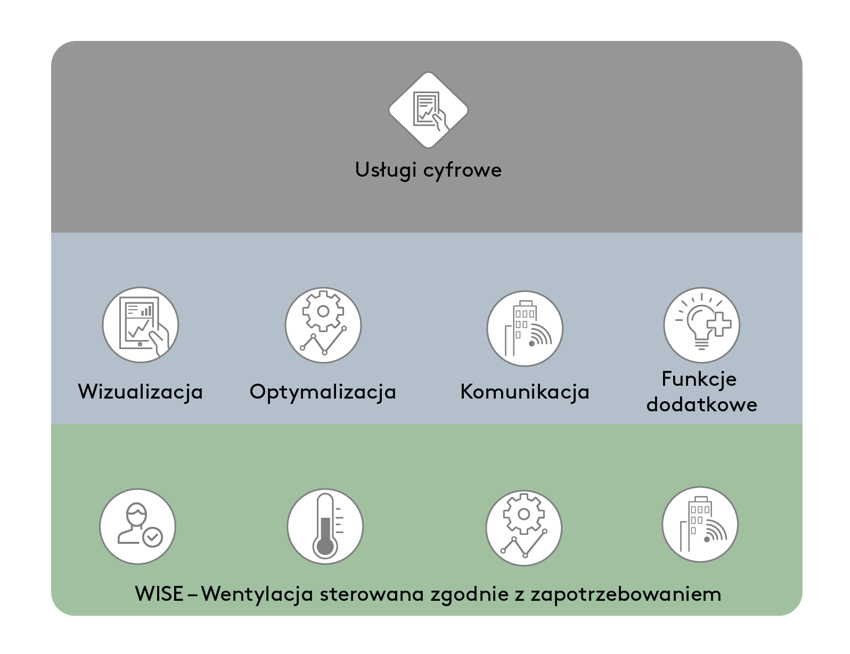 Podstawowym celem systemu WISE jest ścisłe dostosowanie klimatu wnętrza do poziomu wymaganego przez użytkownika. System wentyluje, chłodzi i ogrzewa, robiąc to intuicyjnie i niezauważalnie, co zmniejsza koszty energii i korzystnie wpływa na komfort. WISE stanowi połączenie wysokiej efektywności energetycznej, optymalizacji działania, optymalnego klimatu wnętrza i pełnego przeglądu całego systemu.​