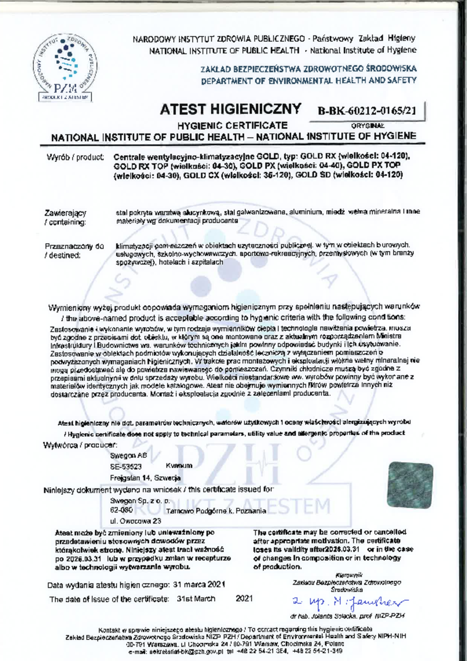 Atest higieniczny GOLD nr atestu B-BK-60212-0165-2021 (pdf 130.37kB) GOLD Deklaracja, certyfikat