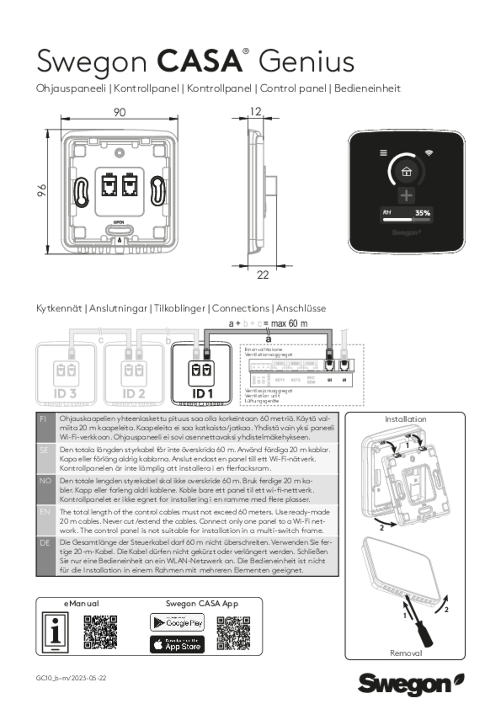 - The panel can be connected to the home WLAN, enabling the ventilation to be controlled remotely from a Swegon CASA mobile app.
