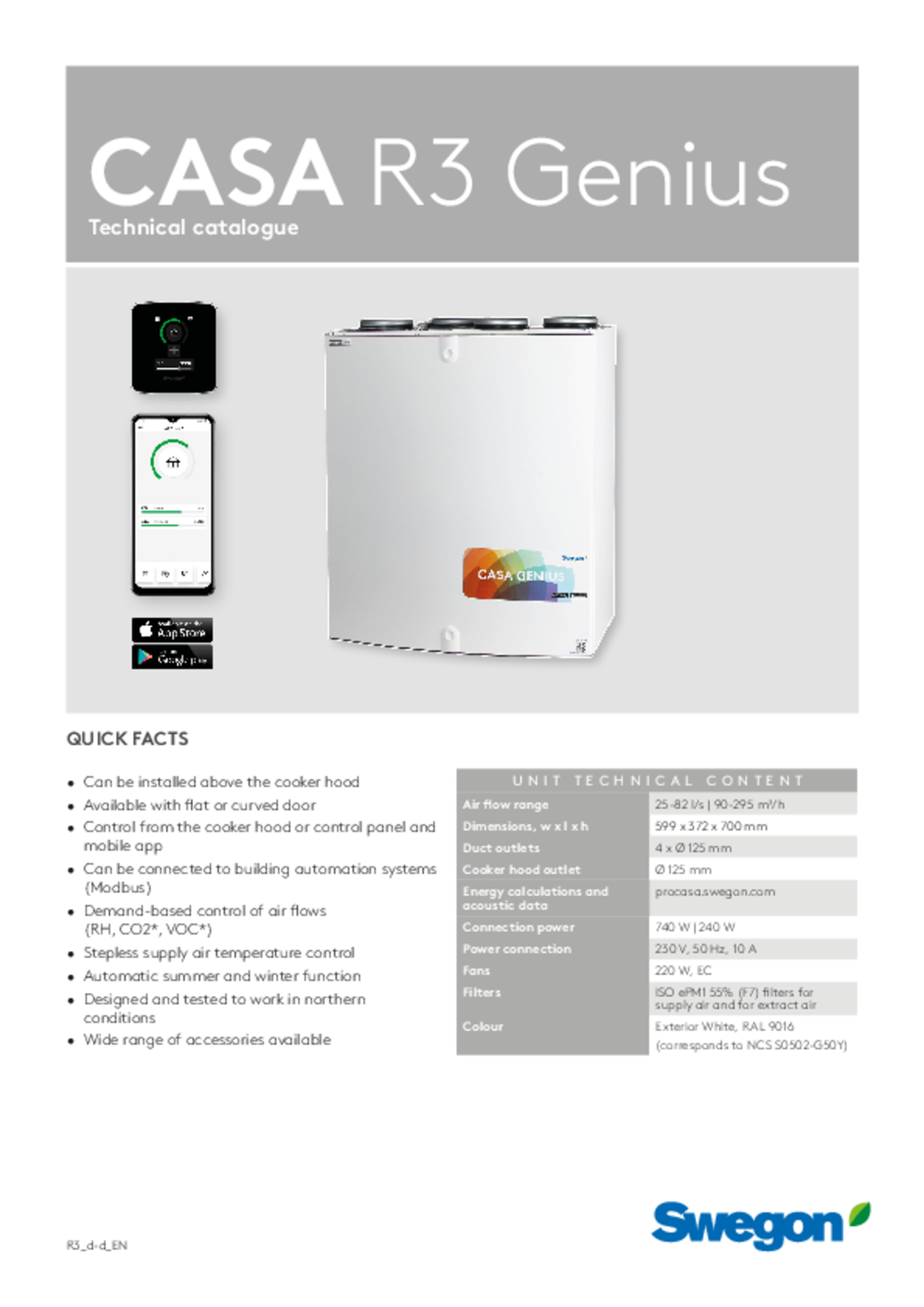 | CASA R3 Genius R RH Flat door | 90-295 | A | - | 4 x Ø 125 mm | 230 V / 10 A | 368-370 | 598 | 700 | 50 |
