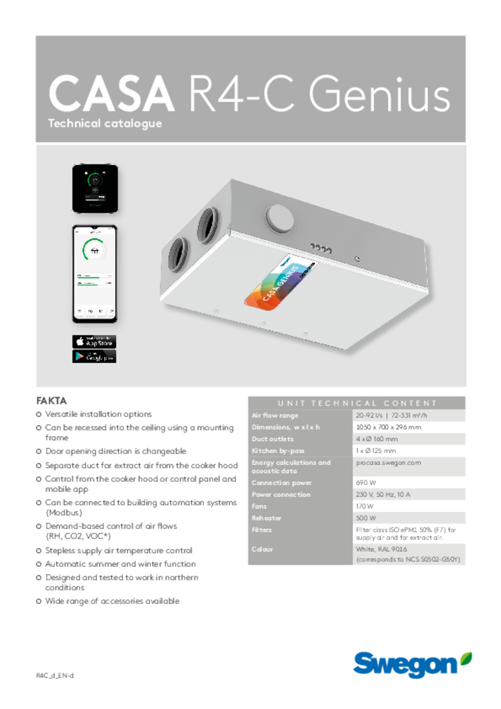 The ventilation unit is controlled from the cooker hood or control panel and via a mobile app (iOS/Android) and can be connected to building automation systems using Modbus.