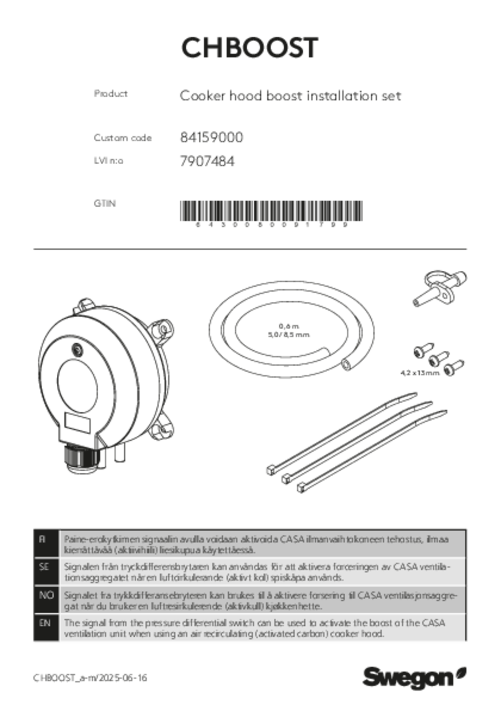 The signal from the pressure differential switch can be used to activate the boost of the CASA ventilation unit when using an air recirculating (activated carbon) cooker hood.