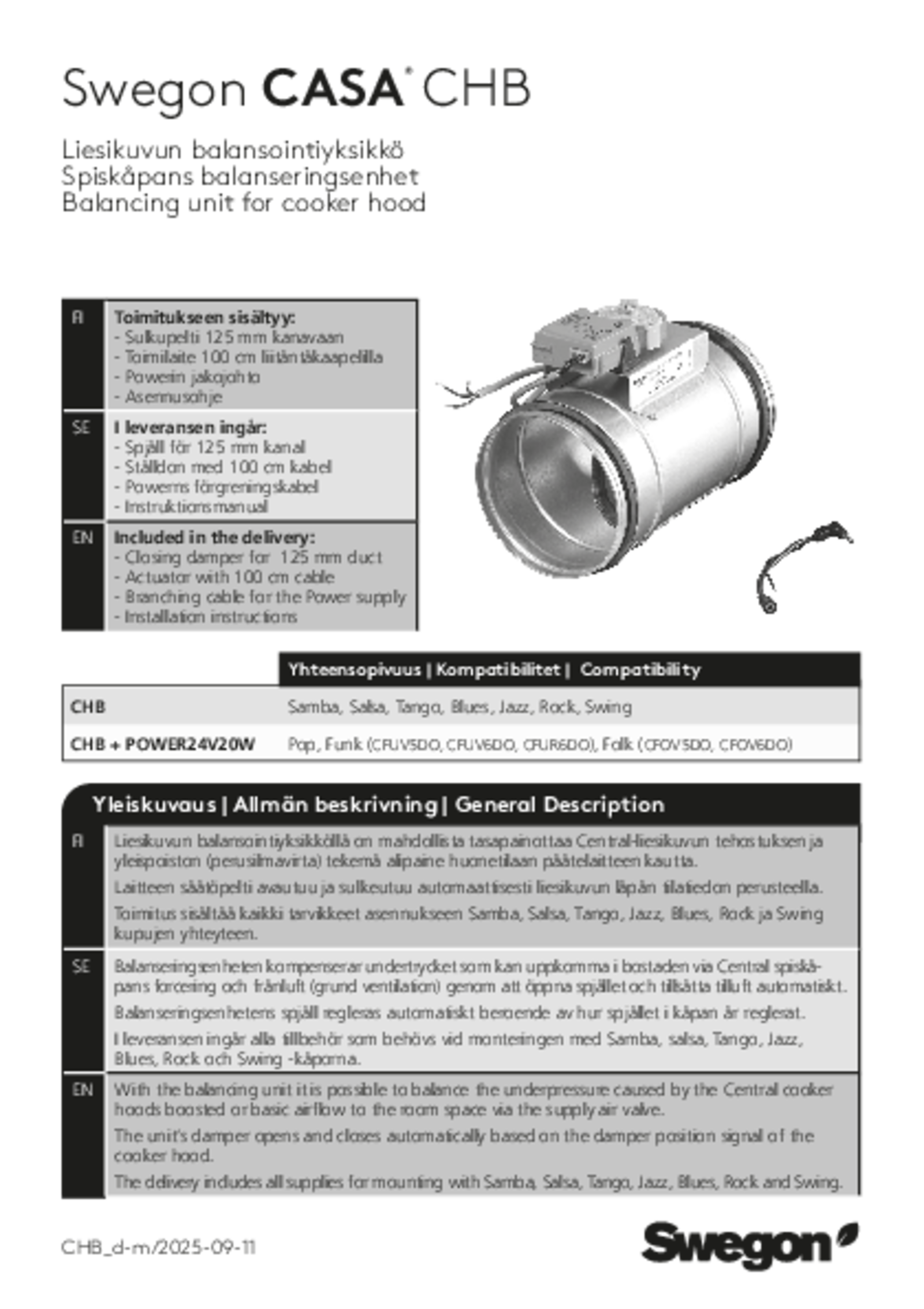 The balancing unit for the cooker hood makes it possible, via a terminal, to balance the negative pressure caused by boosting the Central cooker hood and from general ventilation (basic air flow). The unit’s control damper opens and closes automatically based on a position signal from the cooker hood’s damper.