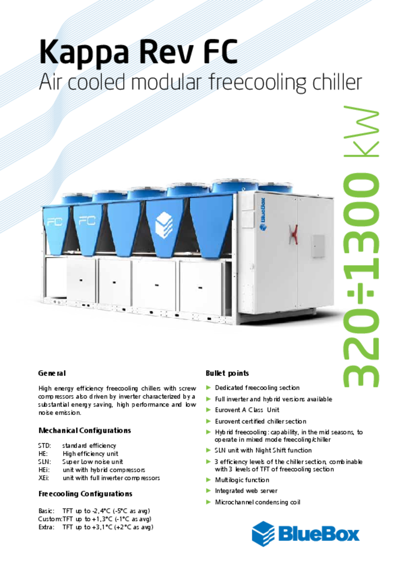 Modular free-cooling chillers for large systems. Wide range: high efficiency multiple combinations and low noise versions. Selectable independent free-cooling module.