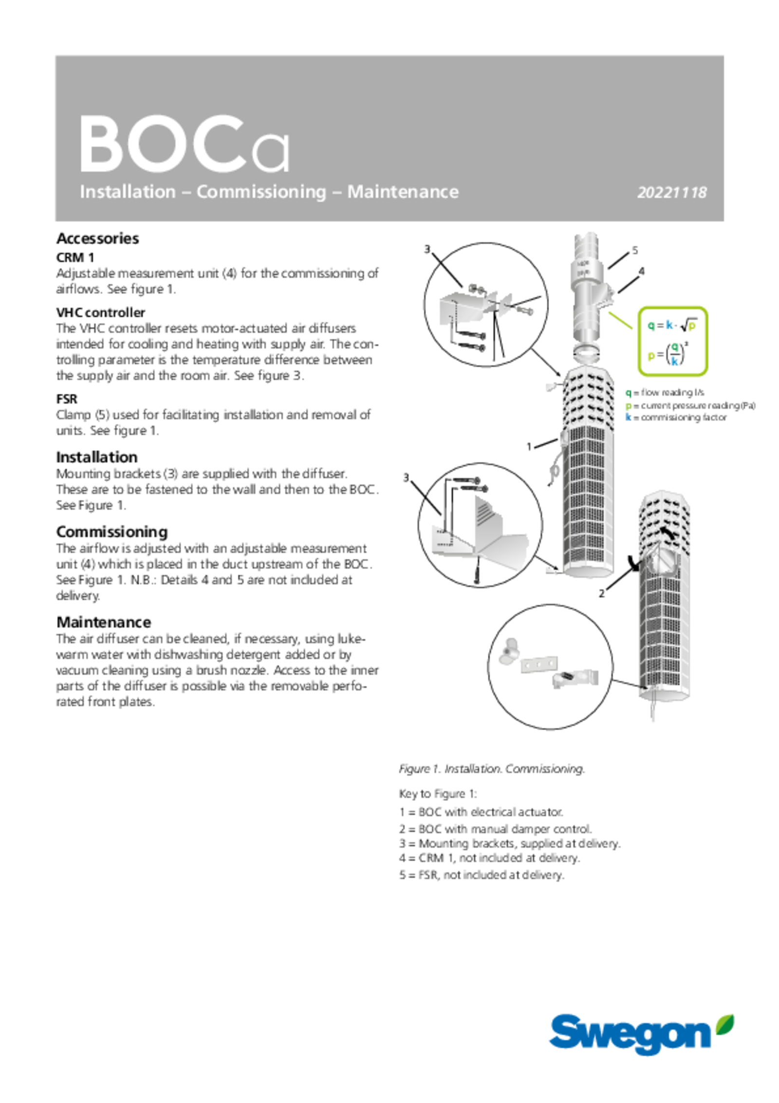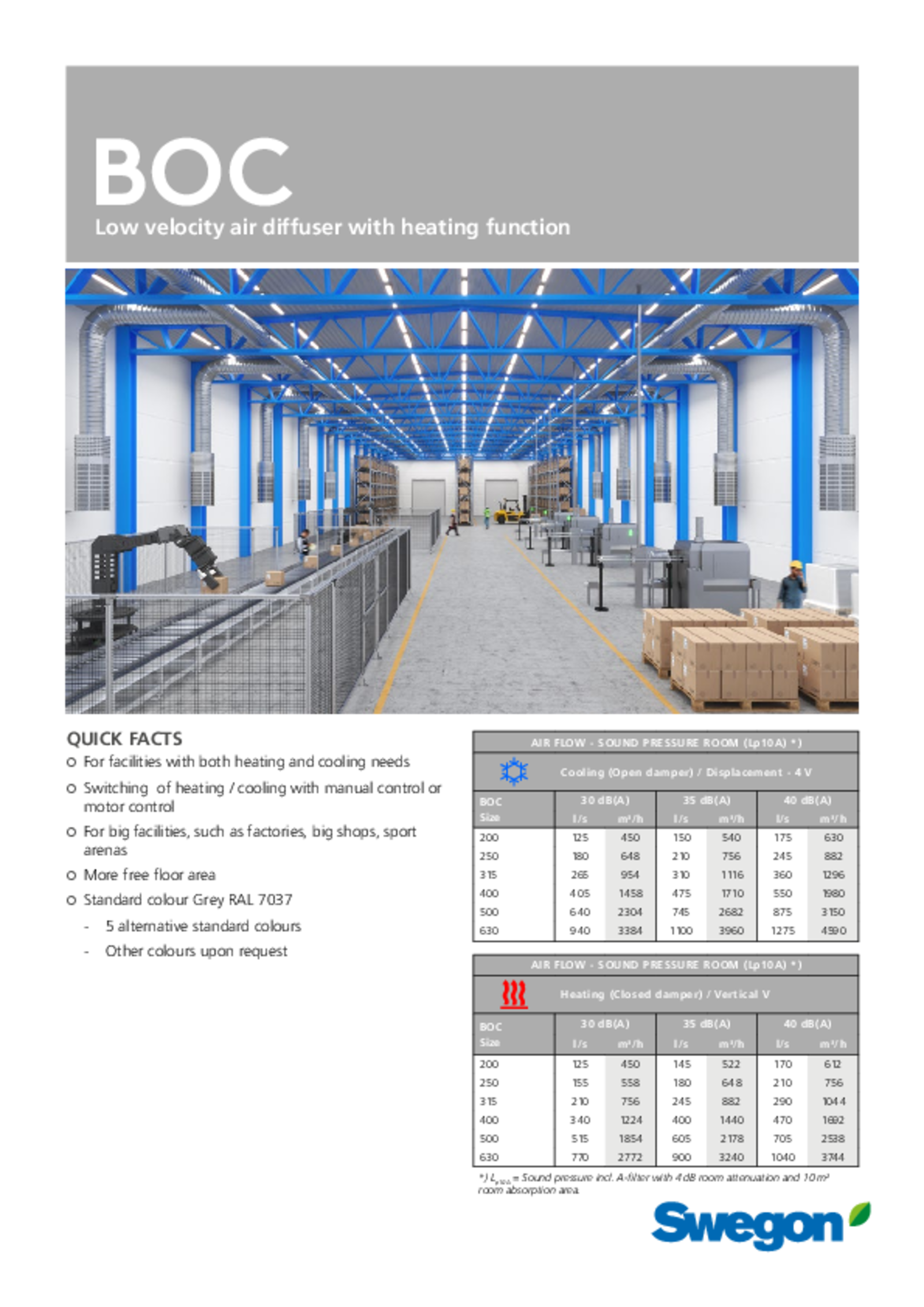 BOC Booster is designed for both temperature controlled and mixing ventilation. The rooms are normally supplied with under tempered air. When heating is required the supply air temperature is increased and the BOC is switched to Booster level, and the warm air is pressed down into the room by the Booster nozzles.