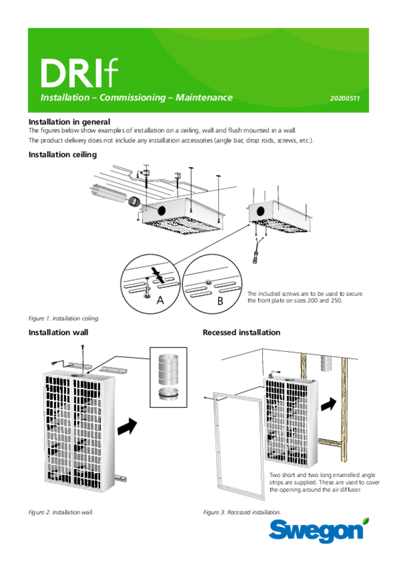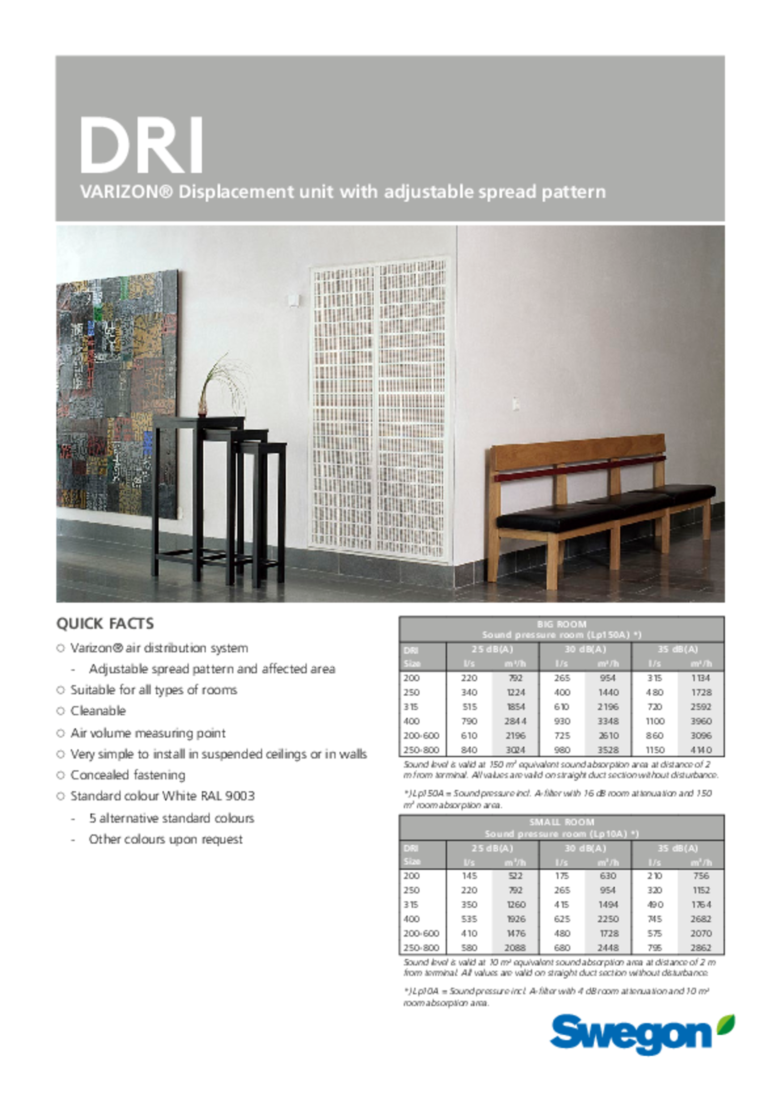 DRI is a complete, rectangular displacement unit for wall or ceiling installation, surface or recessed mounted. It can provide a large air flow at a low velocity in the occupied zone. The spread pattern is easily adjustable due to the adjustable air deflectors.