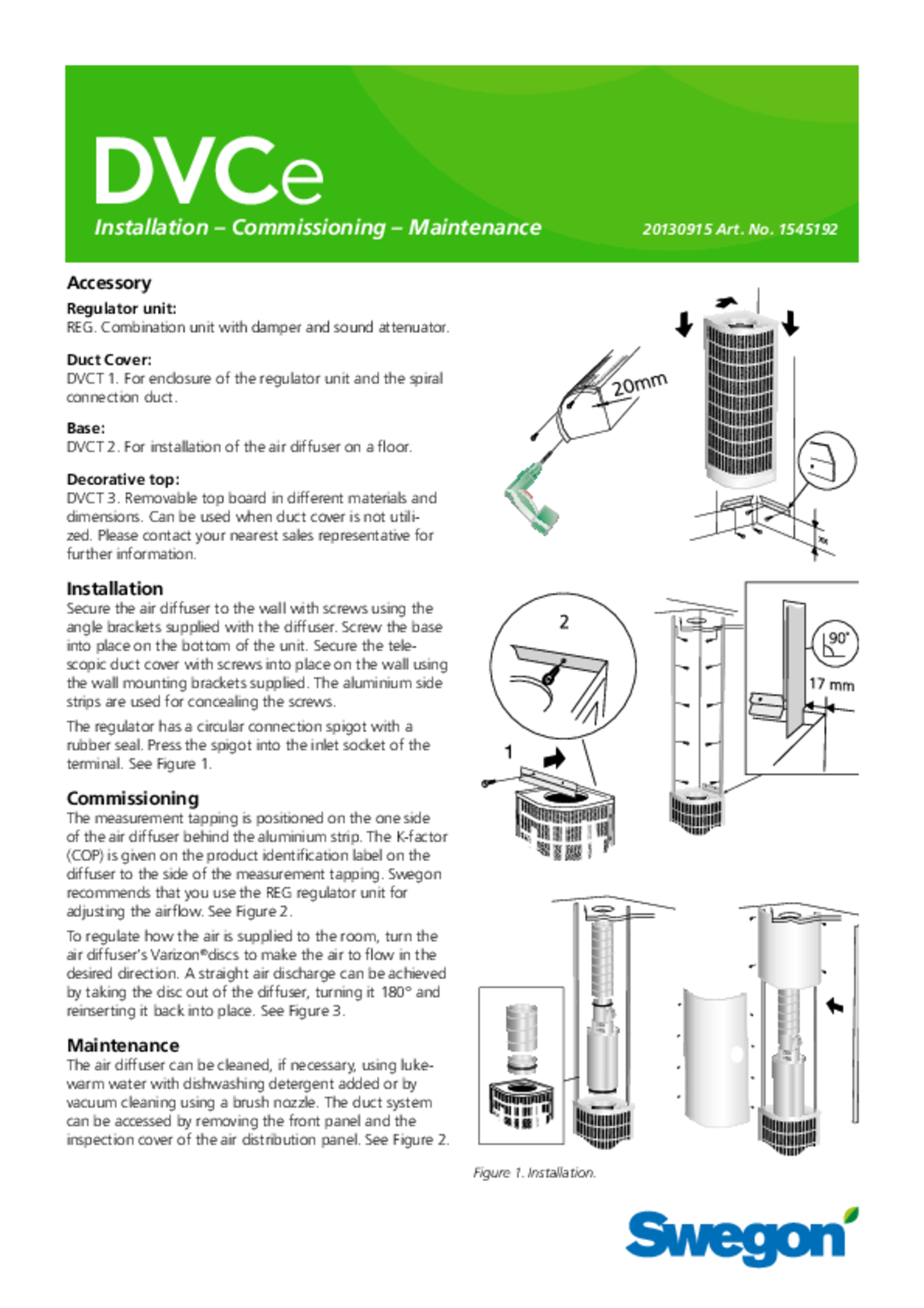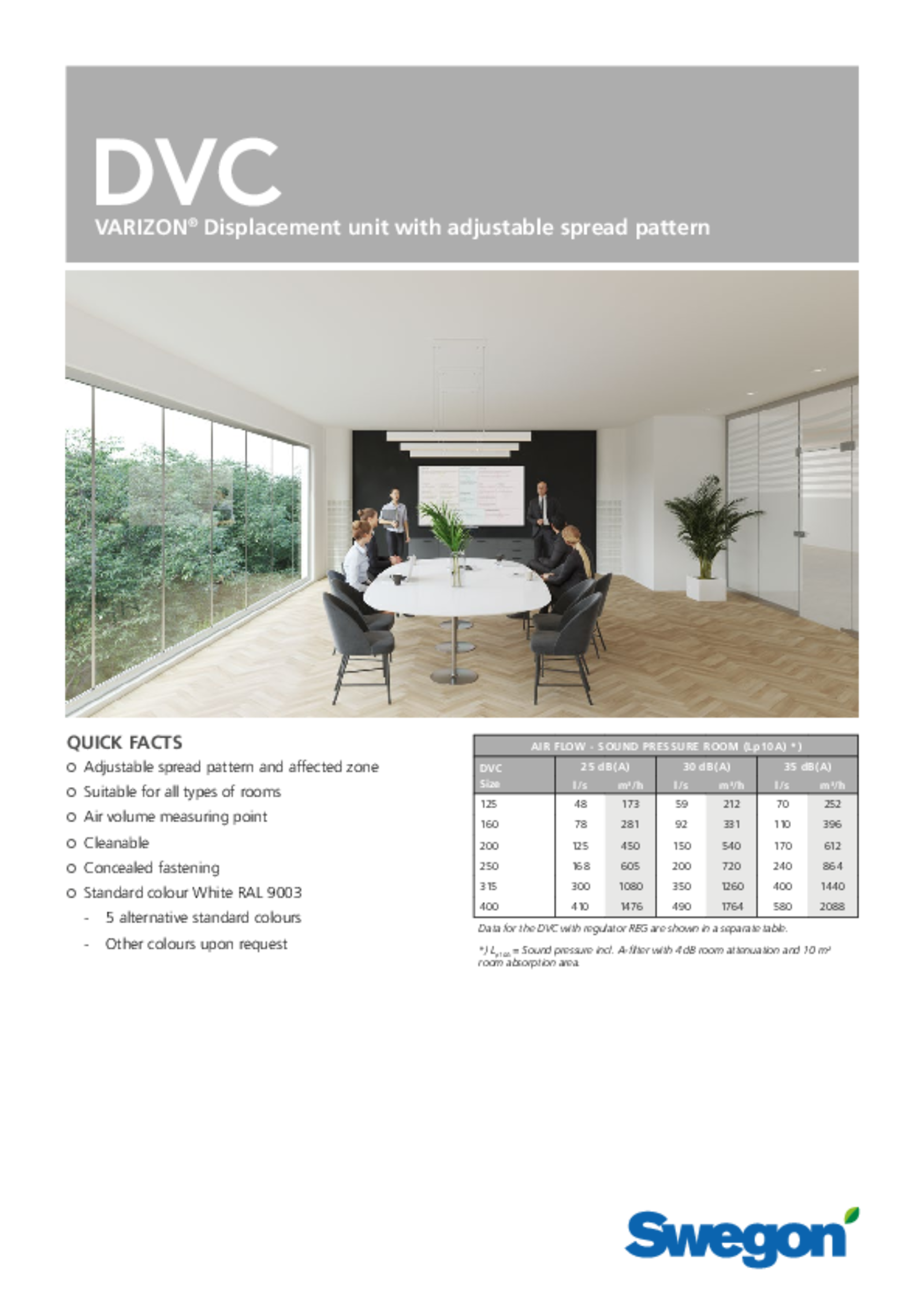 DVC is a complete, quarter-circular displacement unit for wall mounting that provides supply air at low velocity to the occupied zone. The spread pattern is easily adjustable due to the rotatable air deflectors. Accessories for the unit include a floor base duct cover and regulating unit.