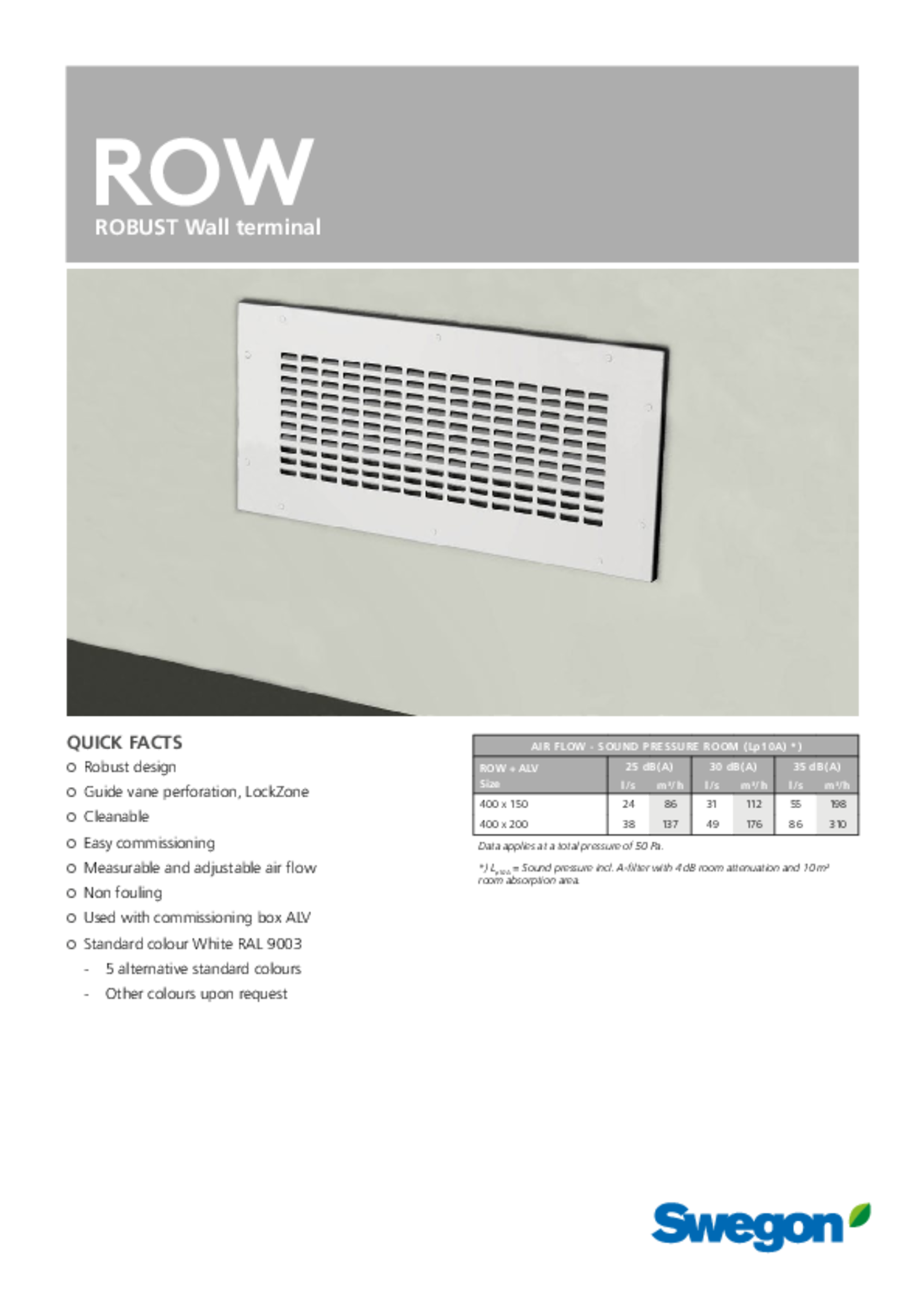 ROW is a rectangular supply air terminal in a reinforced design for wall mounting. The terminal has been approved for use in penitentiaries and can also be used in detention centres, care institutions, schools etc. The diffuser face is equipped with guide vane perforations, which ensures a controlled spread pattern, as well as an aesthetical design. Suitable for constant or variable flow. The ROW can also be used as a low displacement terminal device.