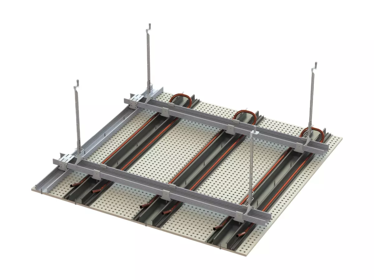 The activation profiles for jointless radiant ceilings are adapted to the standard substructure and replace parts of it. The system is suitable for use with plasterboard, expanded glass granulate and aluminium honeycomb panels.