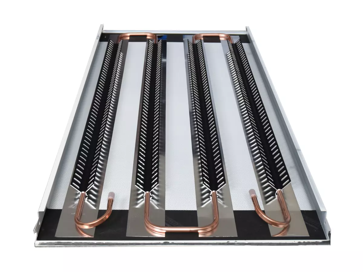 Convector Wings are matt black anodized aluminum profiles with slotted “wings” on both sides. With the profile that opens downwards, the Convector Wings can be attached to the straight sections of a pipe meander. This significantly increases the heat exchange surface of a radiant ceiling, which leads to an increase in the water capacity and a simultaneous activation of the concrete mass via thermal radiation.