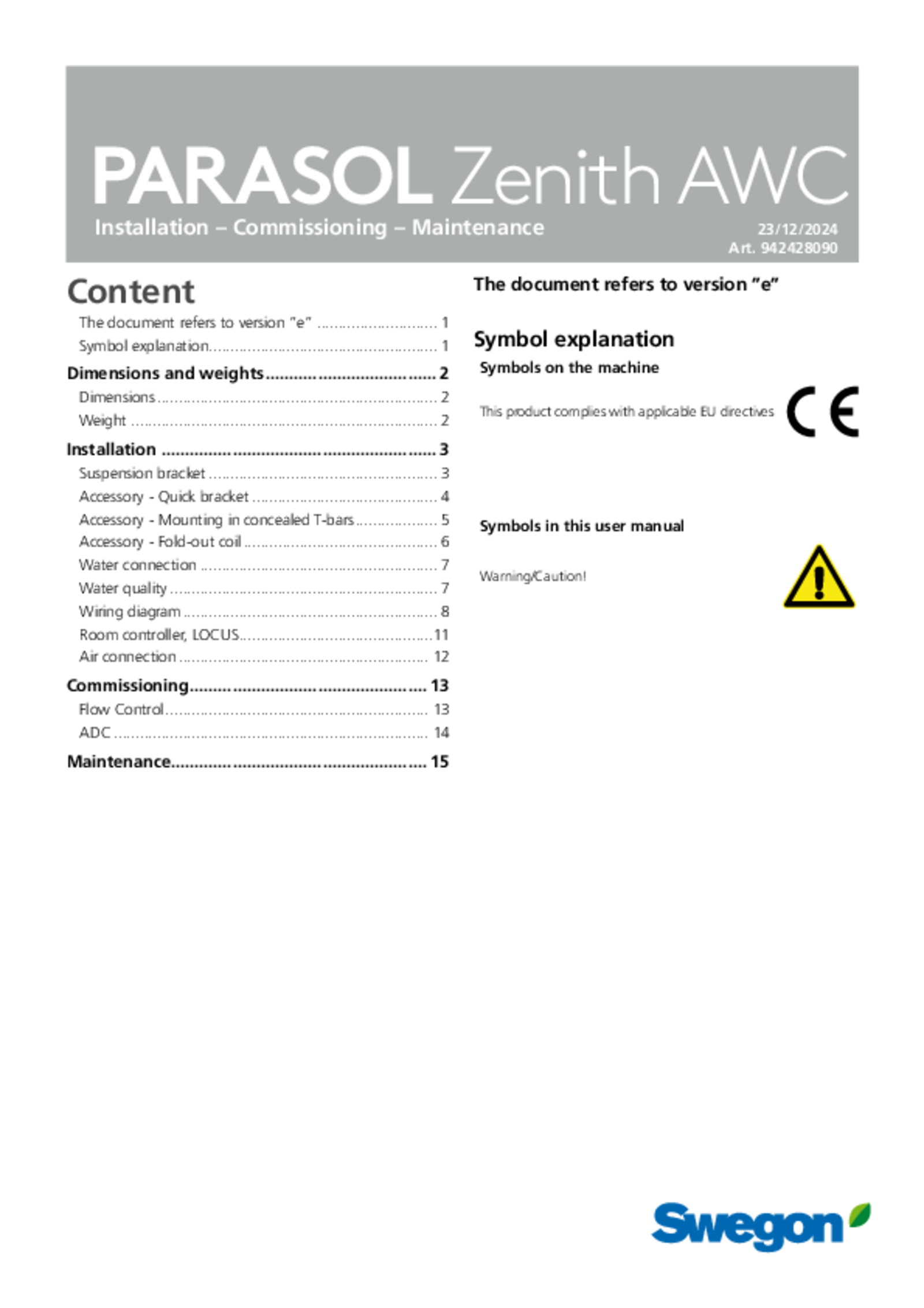 | Installation – Commissioning – Maintenance (pdf 11.61MB) | PARASOL Zenith AWC e | IOM Manual | |