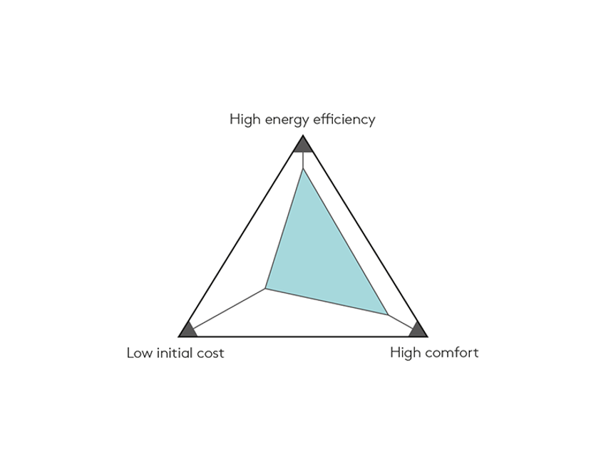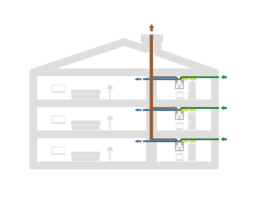 A per-apartment unit is the right approach if the aim is to give occupants extended options for influencing the indoor climate in their own dwelling, or if the property limits the option for installing a centralised unit. A per-apartment unit system eases installation and saves money, since there is no need for fire separation between the apartments. Extensive ductwork is also not needed, which results in minimal falls in system pressure and thereby an energy-efficient and quiet system.